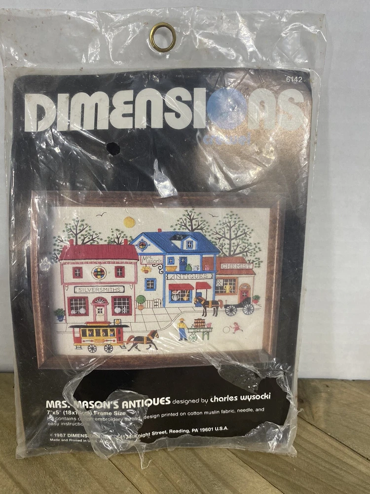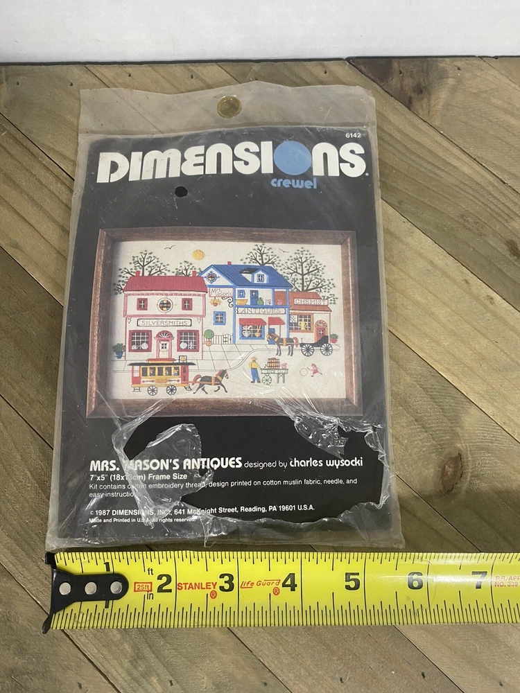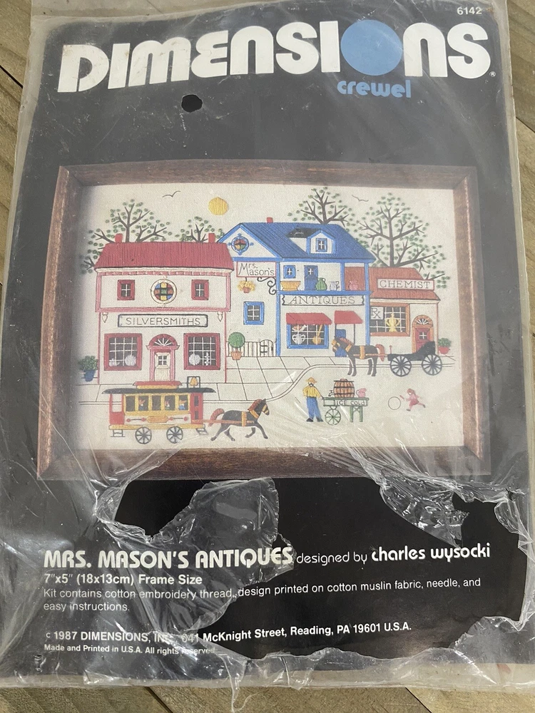 This delightful crewel embroidery kit by Dimensions features Mrs Mason's Antiques, a charming folk art design by Charles Wysocki. The kit includes everything you need to create your own beautiful framed picture, including a needle, fabric/cloth, and thread/floss. The finished size of the piece is 7" x 5". The kit is perfect for anyone who loves antiques and folk art, and is suitable for both beginners and experienced embroidery enthusiasts. With its intricate details and whimsical design, this kit is sure to be a cherished addition to your home decor or a thoughtful gift for a loved one.