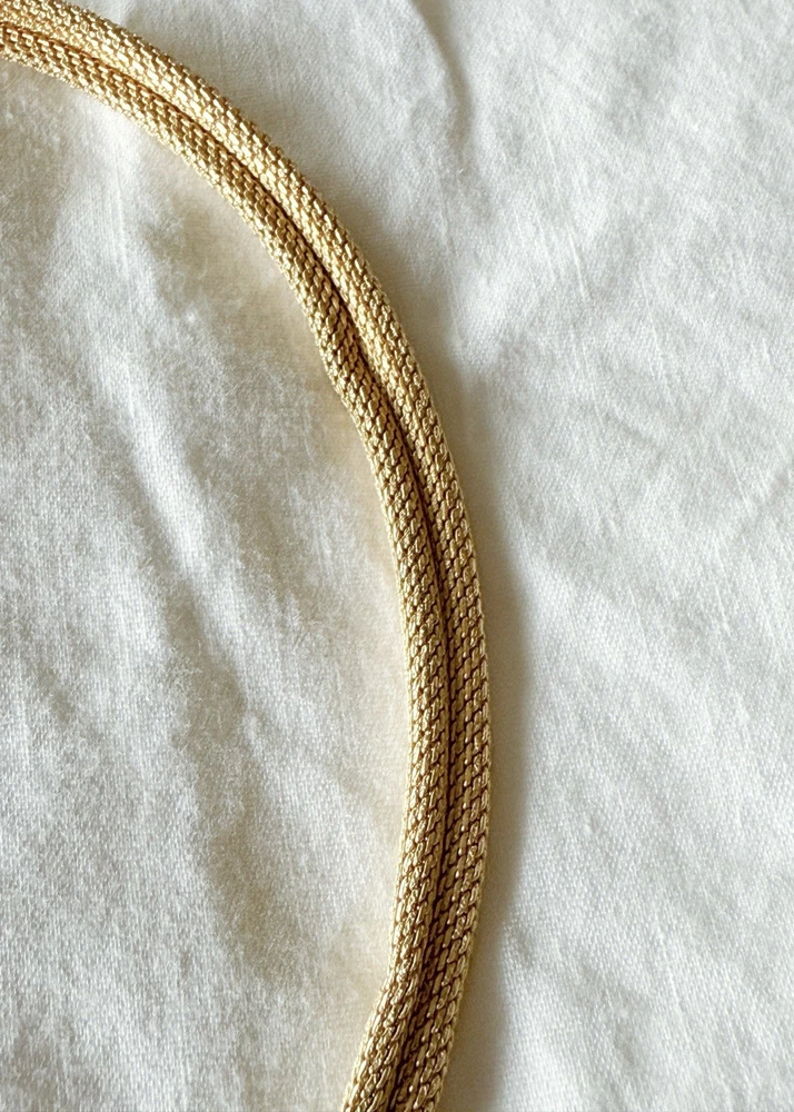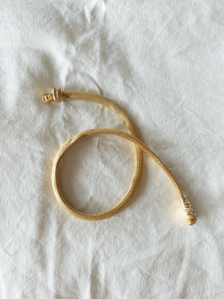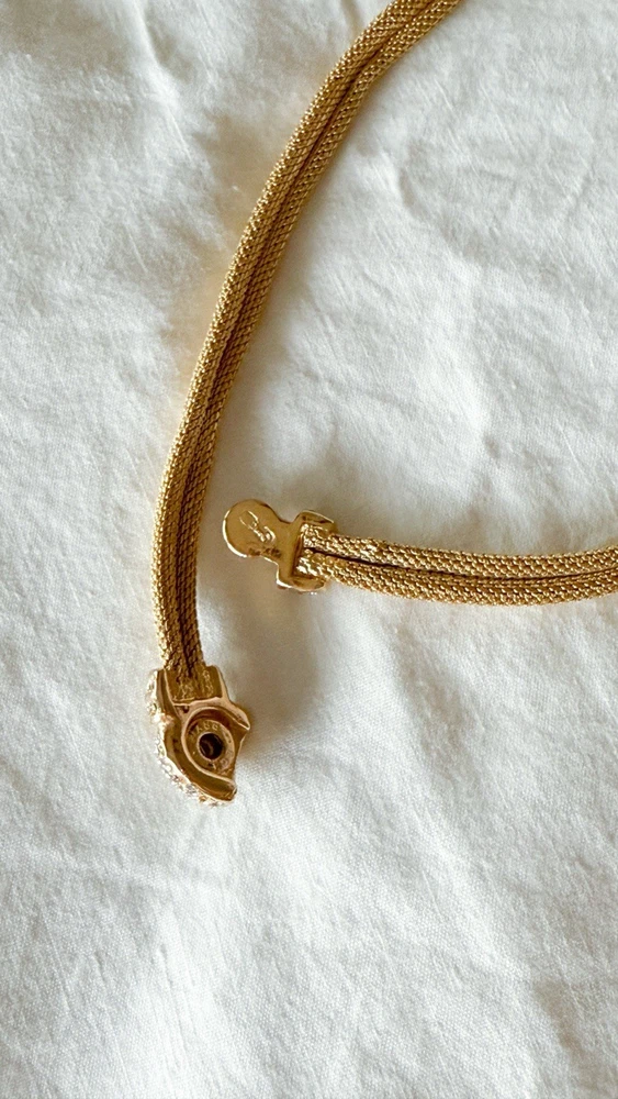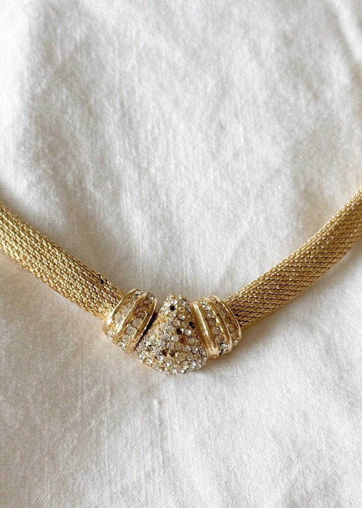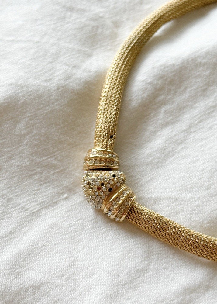 Vintage 1980's Christian Dior mesh collar featuring bold gold-tone mesh design and a statement crystal-encrusted center. Press clasp front closure & Dior signature on the clasp back. Details: • Designer: Christian Dior (signed on clasp) • Era: Vintage 1980s • Material: Gold-tone mesh metal • Centerpiece: Dome-shaped with pavé-set clear crystals • Closure: Fold-over PRYM clasp • Measurements: 38cm length, .9cm width, weight aprox 55g. Condition: Good vintage condition with some signs of age-related wear. The gold-tone finish remains rich and untarnished, and the crystals retain their brilliance. A few stones are missing from the centerpiece, and the mesh chain has minor soft kinks and slight flattening in areas—consistent with the natural flexibility and age of the material. These aspects do not detract significantly from the beauty or wearability of the piece but are reflected in the price. Rare and collectible find for Dior lovers and vintage jewelry enthusiasts alike.