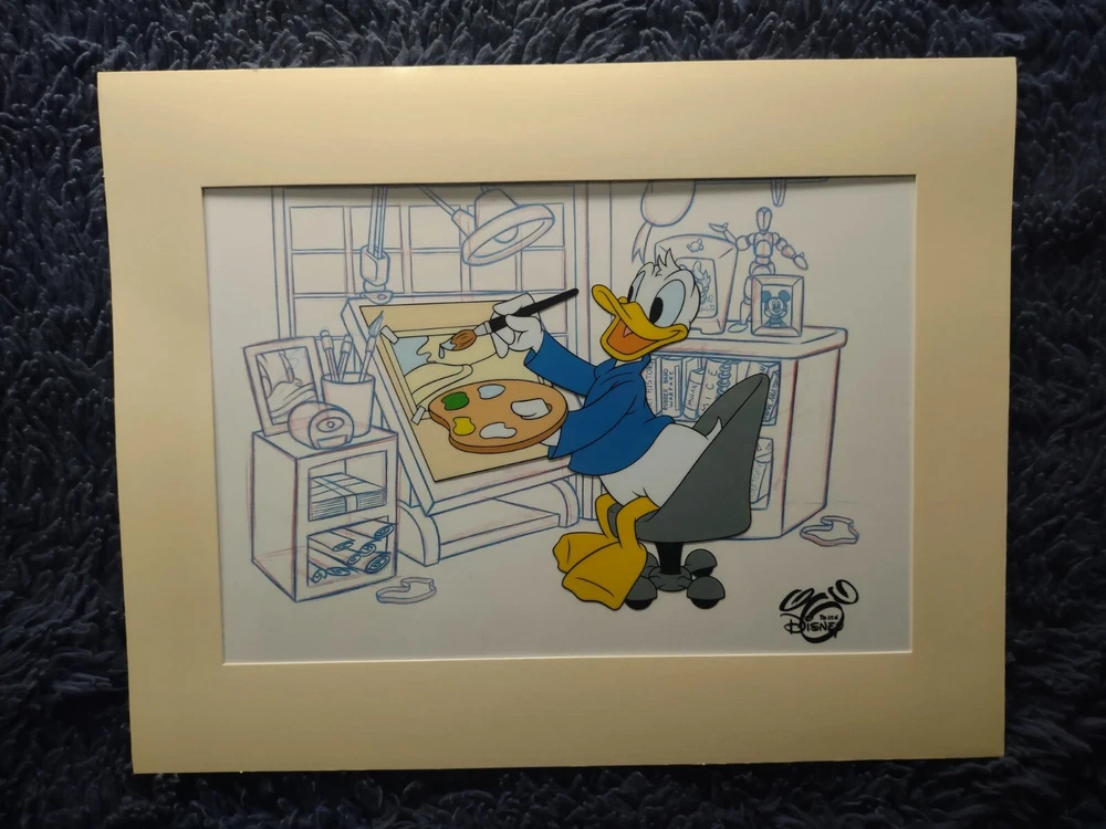 2001 Disney animation cel "Celebrating 65 years of Donald Duck". Purchased for my collection while visiting Disney world Orlando Florida. Cel is new in original box. Has never been removed from the box and never hung. Four (4) available.