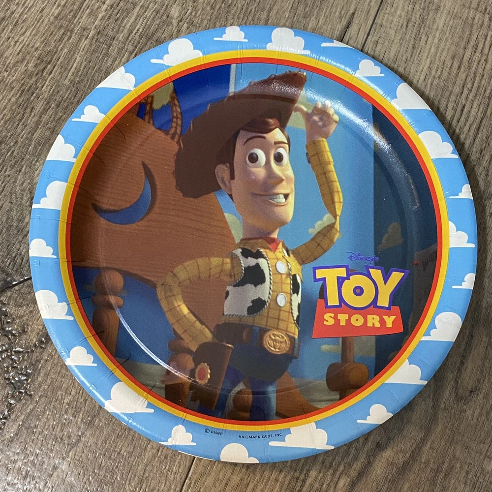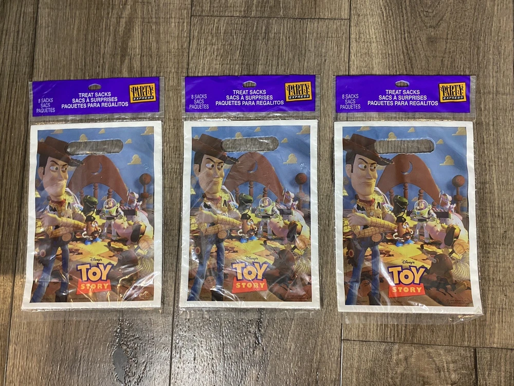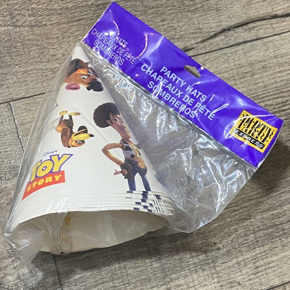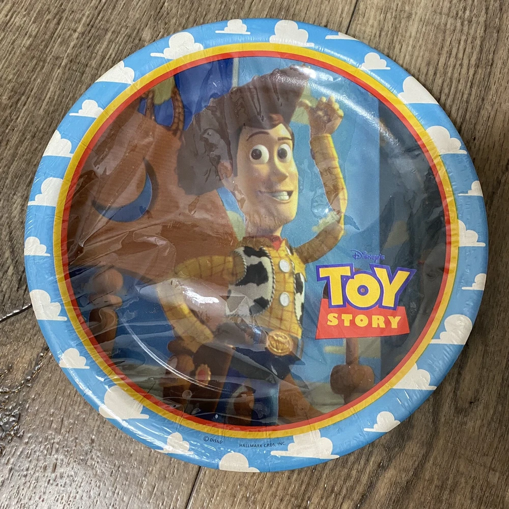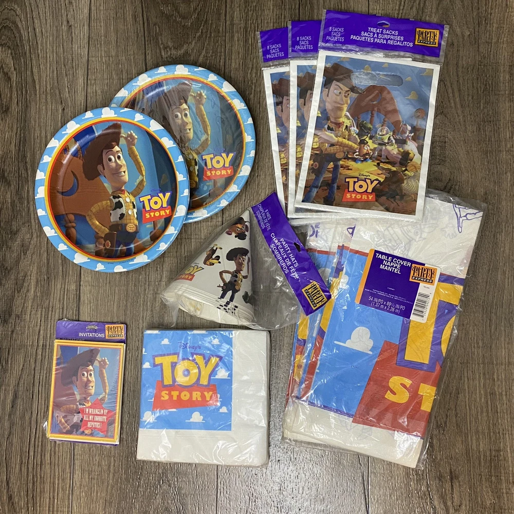 Vintage Disney Pixar Toy Story Party Pack Factory Sealed Package Hallmark 1995. You Story Set includes: 2 Factory Sealed Tablecloths 3 Factory sealed gift bags (8 each) 1 Factory Sealed napkins (16) 1 Factory Sealed invitations (8) 1 factory sealed party hats (8) 1 factory sealed plates (8) 1 open set of plates (7) Please see Pictures for all included and condition.