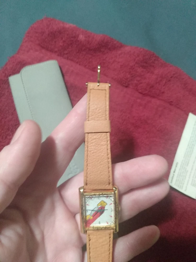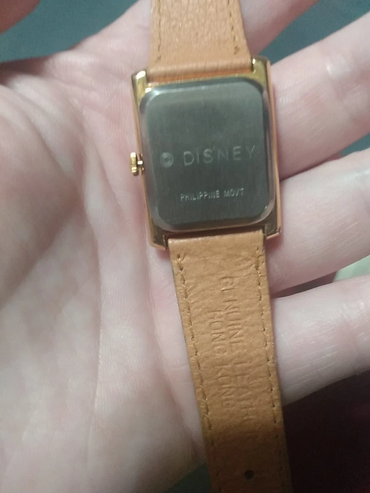 Used please see photos for imperfections. Currently not working, I believe it needs new battery. This vintage Disney Rocketeer watch features a gold tank case and a beige leather buckle band. The watch has a rectangular shape and a white dial with two hands. It is powered by a quartz movement with a battery and has a push/pull crown for adjusting the time. The case finish is glossy and the watch is designed for both men and women. It is a great addition to any Disneyana or Rocketeer collections. This watch is a contemporary piece, manufactured in the Philippines, and is perfect for any watch enthusiast.