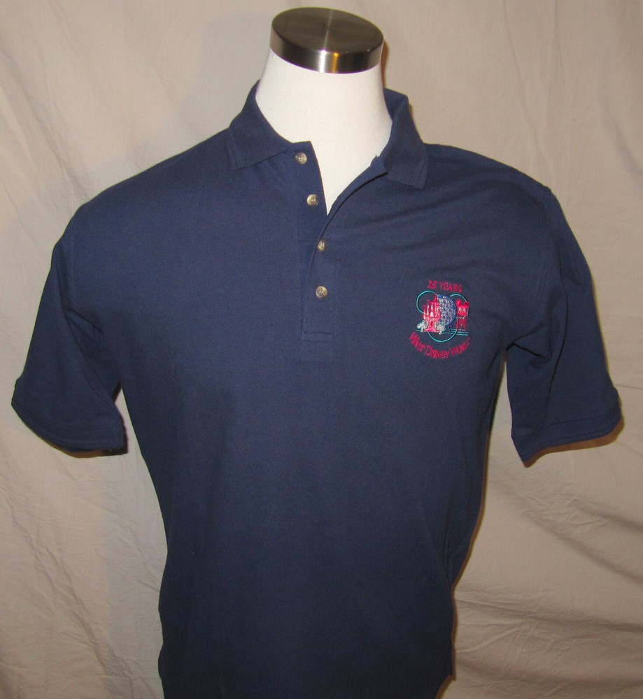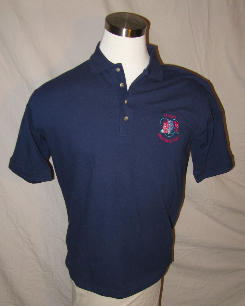 This is a new vintage Walt Disney World 25 Years adult polo shirt Blue in color Made by Mickey, Inc 100% cotton New with tags Adult Size S or Small Armpit to armpit width of 22 inches Overall length of 29 inches If you decide to purchase this item and are unhappy after receiving it, please contact me before getting upset, leaving negative feedback, and having a bad day as we can work something out.<