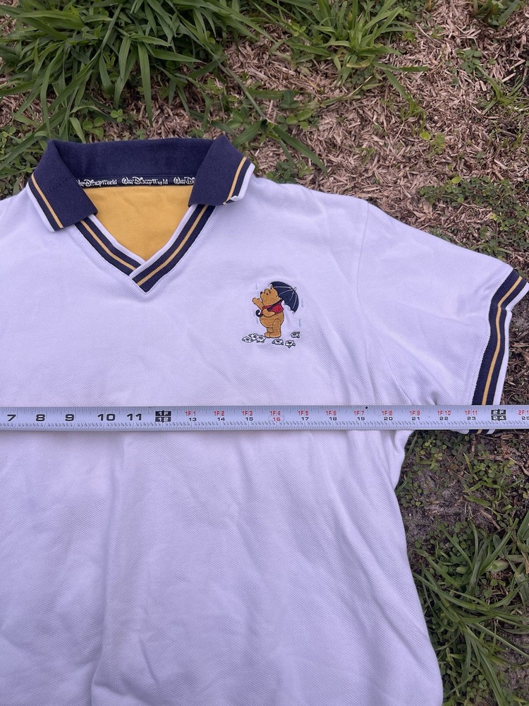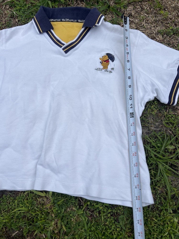 This vintage Walt Disney World Winnie the Pooh V-neck collared white shirt in youth size XL is a delightful piece for collectors or fans of the beloved Disney franchise. The classic design featuring Winnie the Pooh and the iconic V-neck collar make it a charming addition to any Disneyana collection. Made with high-quality materials, this shirt is a nostalgic reminder of the magic of Walt Disney World.