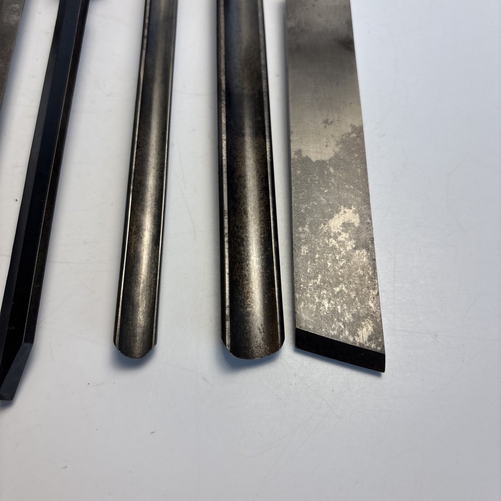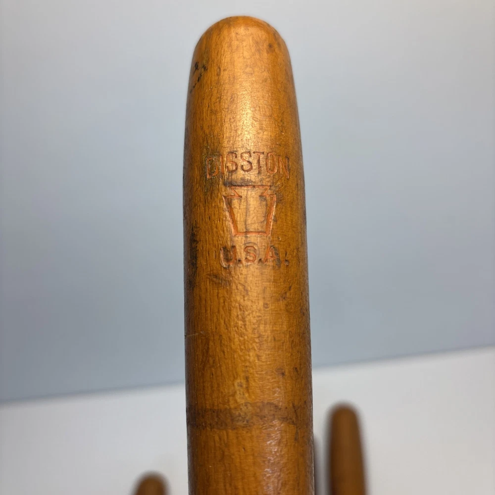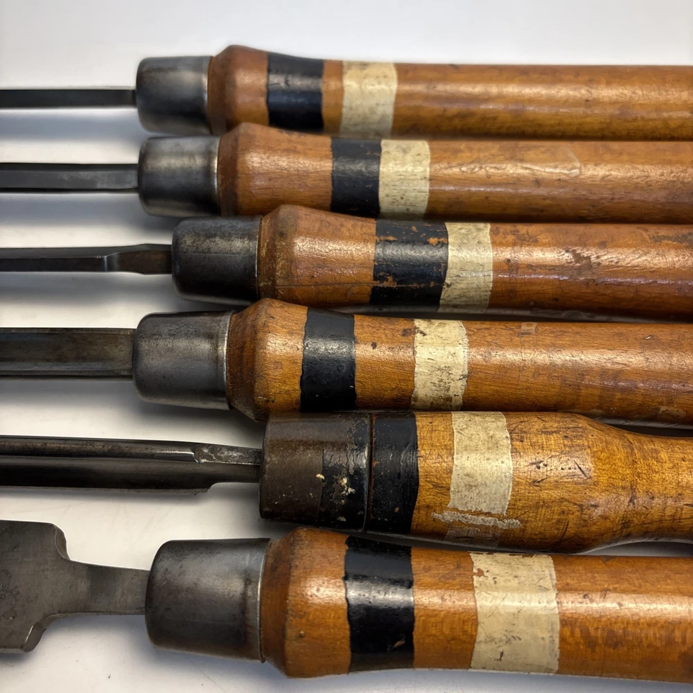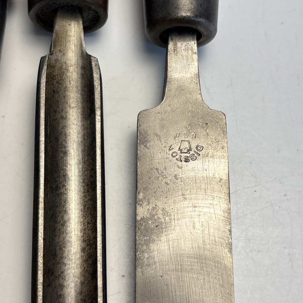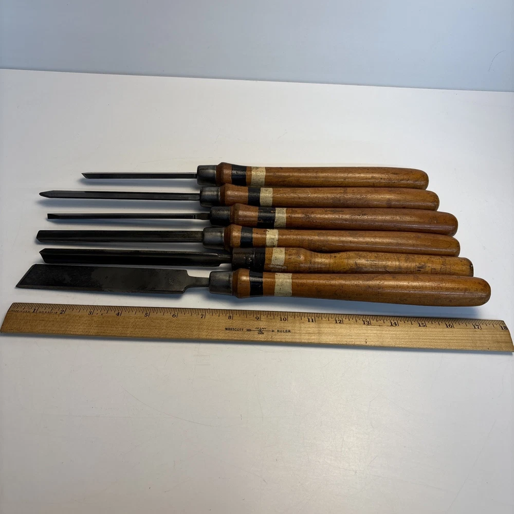Vintage set of 5 Disston 1 Greenlee wood turning chisels for lathe use. Each tool measures approximately 17 inches overall and features turned wood handles with metal ferrules. Includes a variety of cutting profiles such as gouges, skews, and scrapers for shaping and finishing wood on a lathe. Shows wear from use including patina, surface marks, and areas of discoloration on the blades. Cutting edges show use and may benefit from sharpening. Handles show age, wear, and minor marks but remain solid. See photos for complete details.