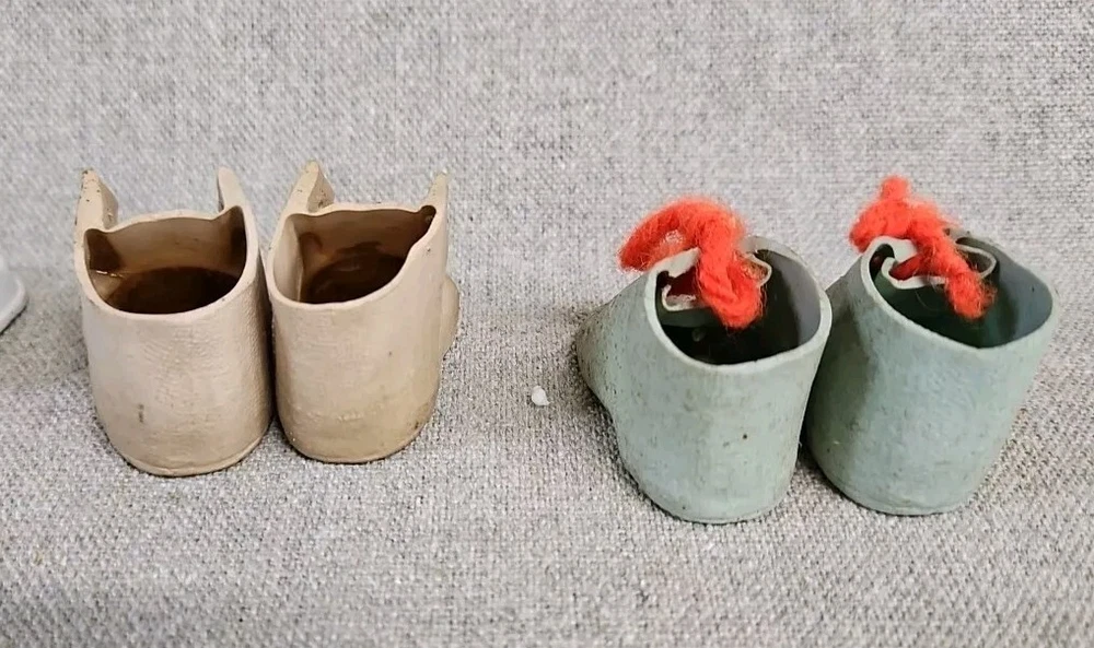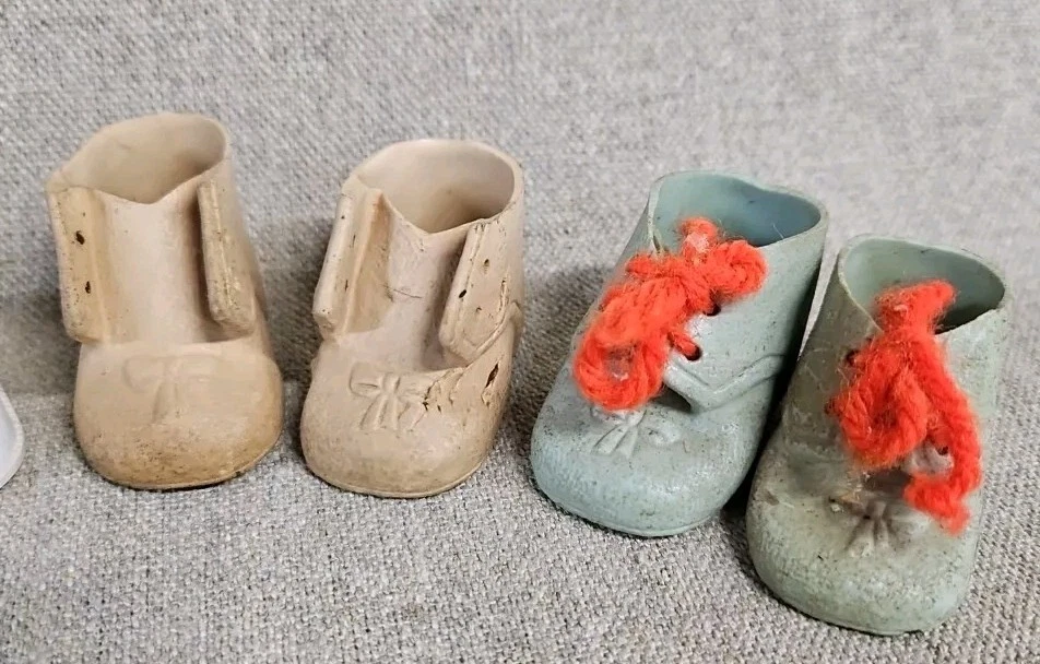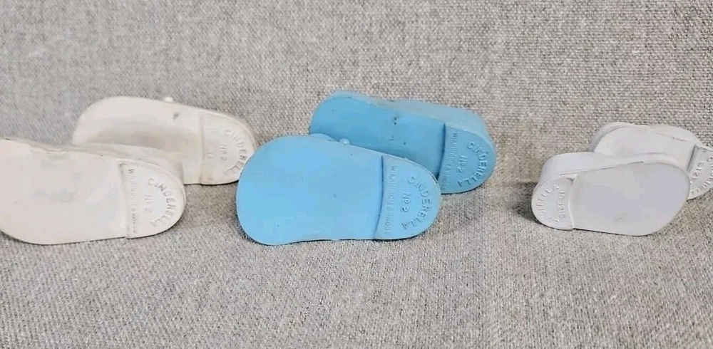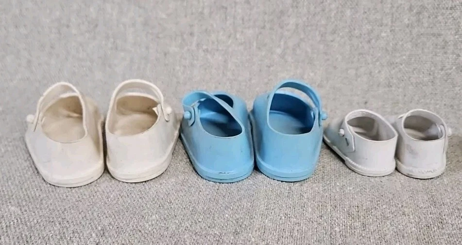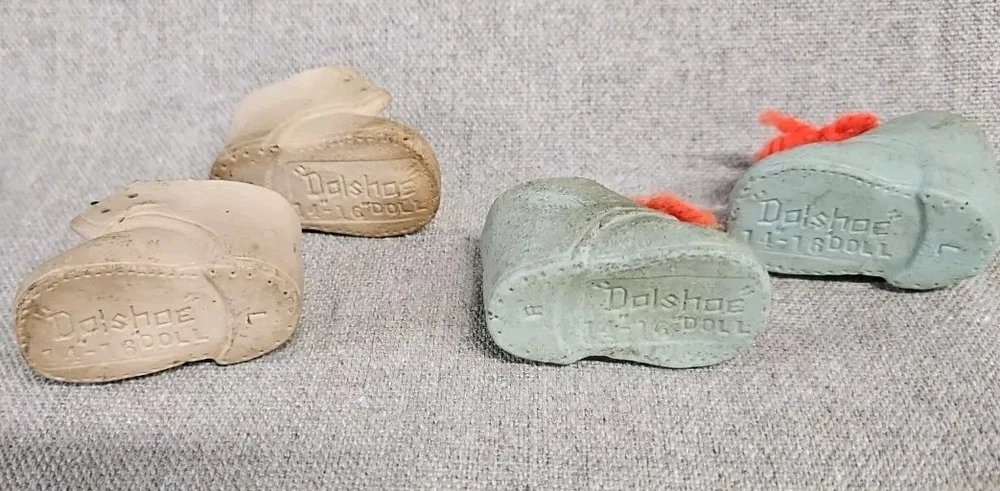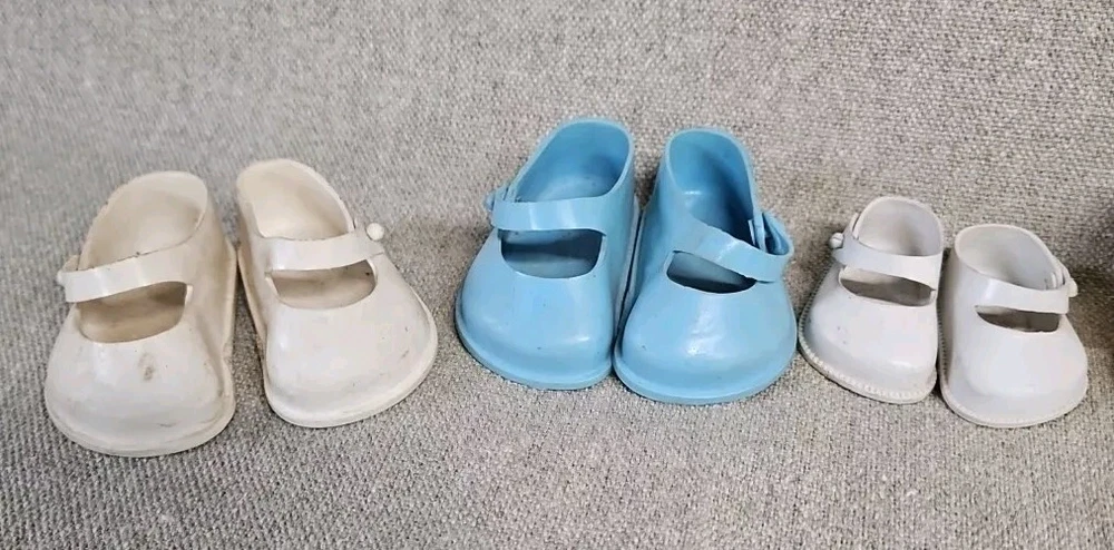 These are old. The Dolshoe brand shoes are fragile and have some damage as shown by photos. The Cinderella brand Mary Jane's are in good condition but need some cleaning.