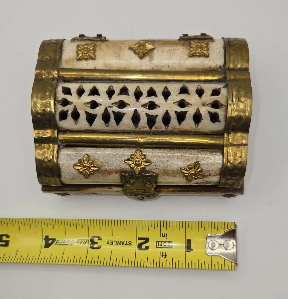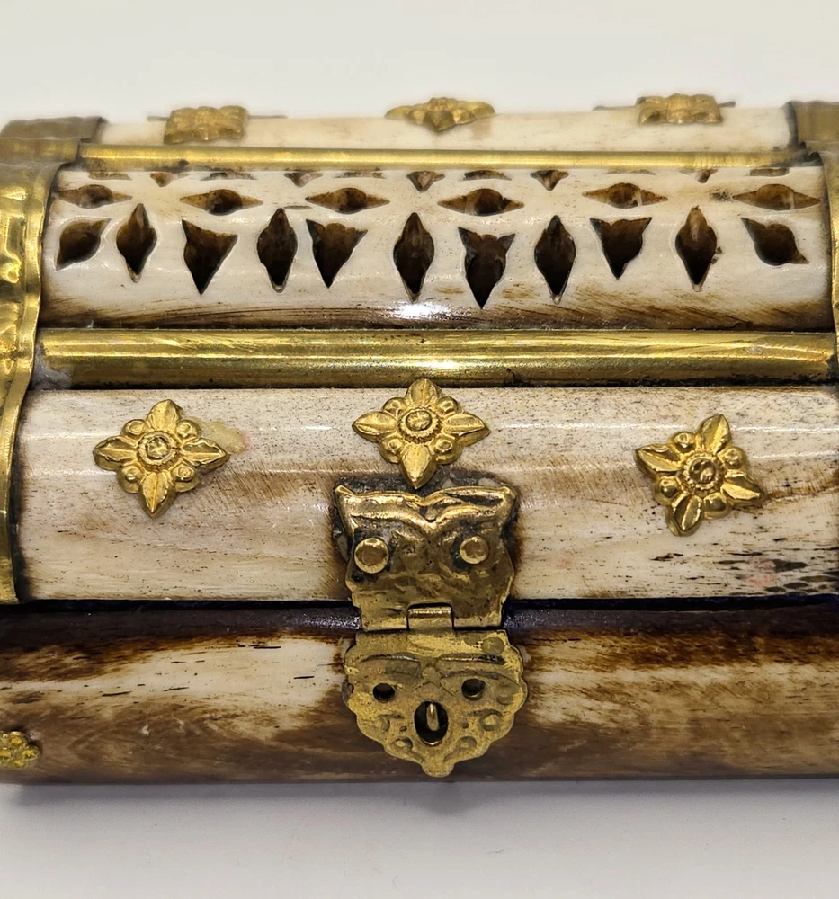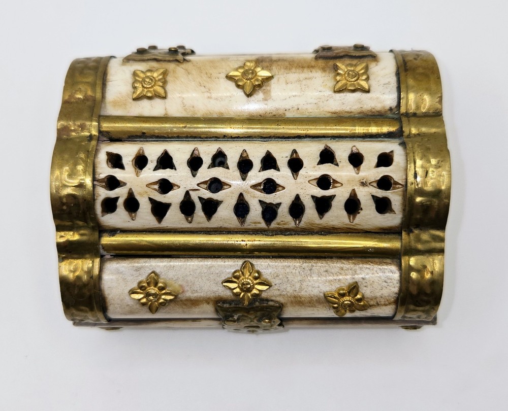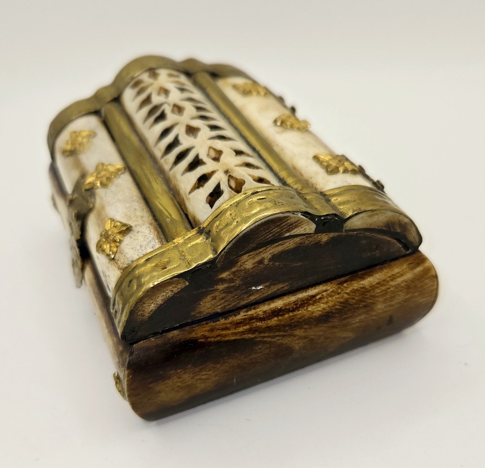Vintage Domed Lid Trinket Box with Ornate Bone Brass & Wood Design from India