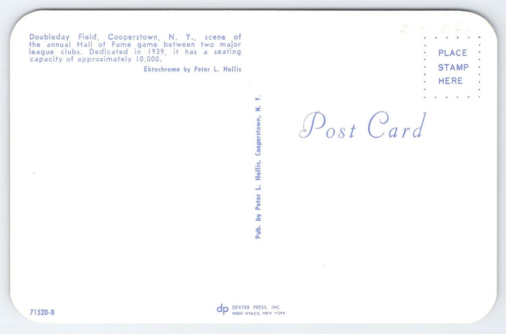 This vintage postcard features a vibrant, colorized view of Doubleday Field in Cooperstown, New York, known as the historic site for the annual Hall of Fame baseball game between major league clubs. The image captures the classic grandstand filled with fans and players on the field, showcasing an iconic era of American baseball. Doubleday Field was dedicated in 1939 and has a seating capacity of approximately 10,000, making it a significant landmark for baseball enthusiasts and collectors alike. Printed by Dexter Press, Inc. of West Nyack, New York, this postcard uses Ektachrome technology by Peter L. Hollis, providing rich colors and sharp detail typical of mid-20th century postcards. Its standard size of 5.5 x 3.5 inches and clean white back with clear text and publisher details make it a collectible piece for those interested in sports memorabilia, vintage postcards, or Americana. Ideal for display or gift-giving, this postcard commemorates a beloved sports venue steeped in history. SHIPPING COST: ALL ORDERS ARE EXPIDITED, ORDERS ARE TYPICALLY SHIPPED WITHIN TWO HOURS OF MY RECEIPT OF PAYMENT UNLESS I AM OUT OF TOWN SOURCING NEW ITEMS OR MY STORE IS IN VACATION MODE BOTH OF THESE MITIGATING FACTORS ARE RARE. SEE MULTIPLE SCANS OF ITEM. Please use eBay magnifier for a more detailed view of the item. CONDITION: Moderate wear and some soiling. Combined shipping always available on multiple items. PLEASE USE THE E-BAY SHOPPING CART AS IT MAKES COMBINED SHIPPING EASIER TO SEE. Thank you! I have a great passion for collecting postcards, photographs and ephemera. My store offers many rare and hard to find items as well as always being able to guarantee their authenticity as vintage and genuine. Each week I will be posting rare, unusual, high-quality and unique items for the advanced, intermediate and beginning collector. Our items are ALWAYS vintage. Please bookmark our store and I look forward to helping you build your collections!