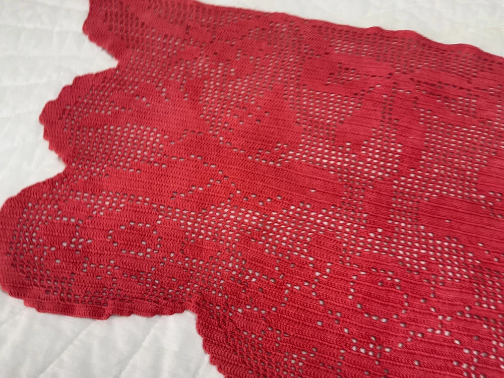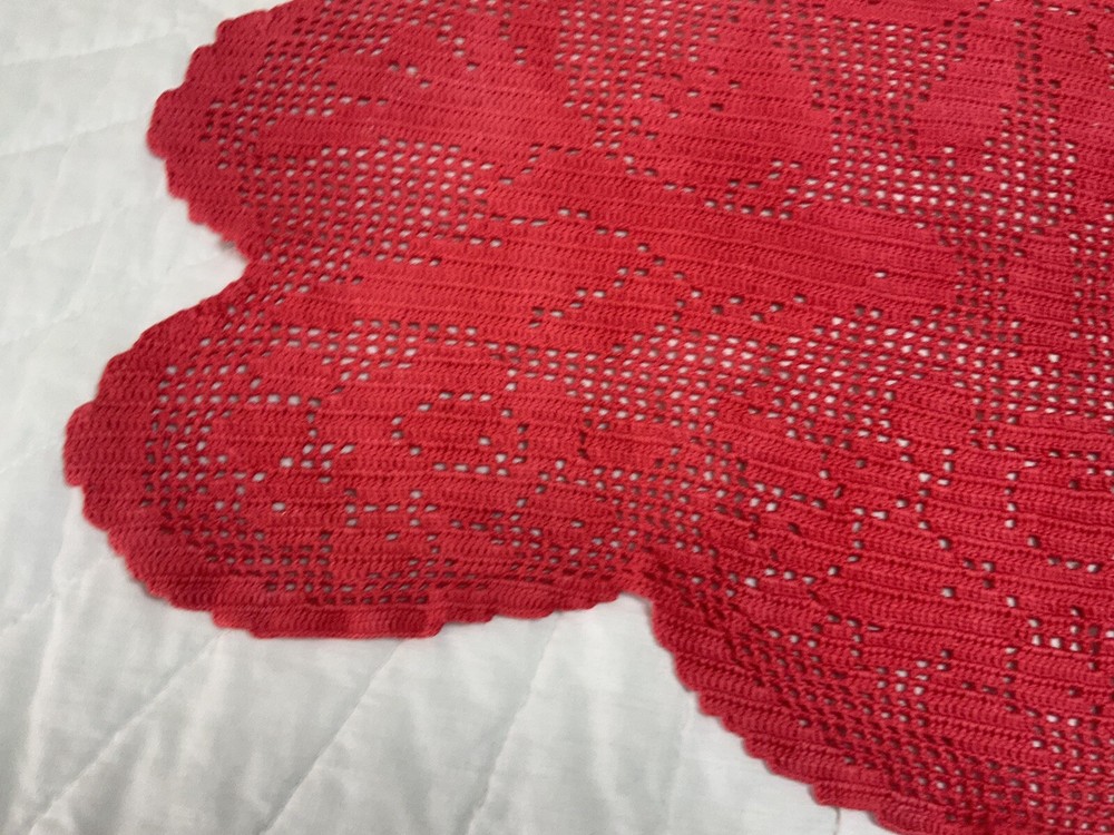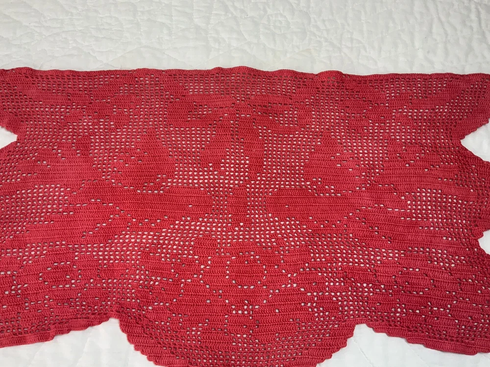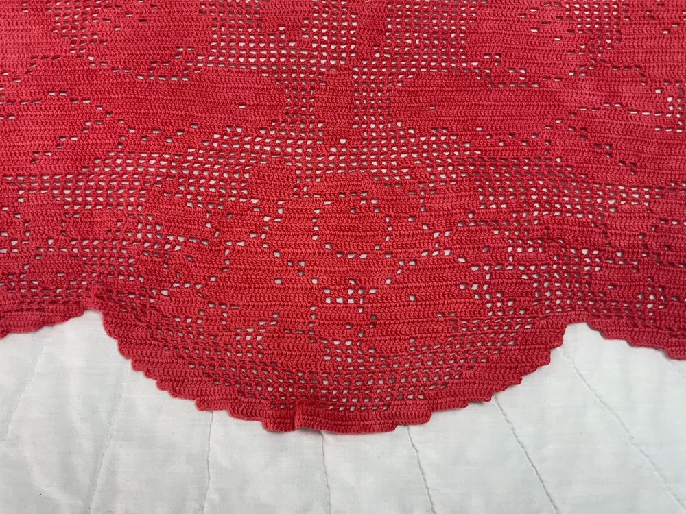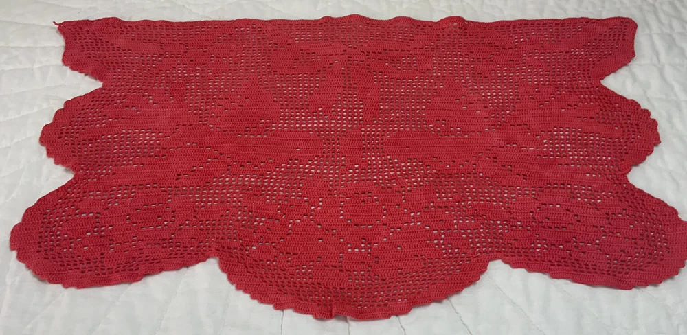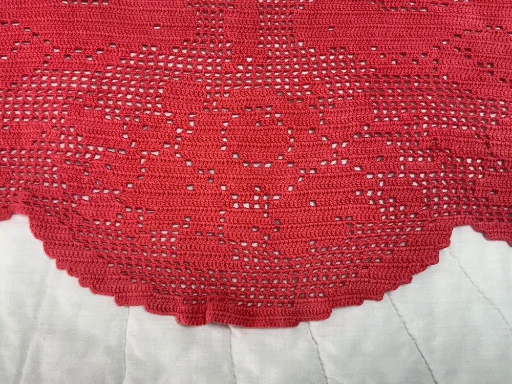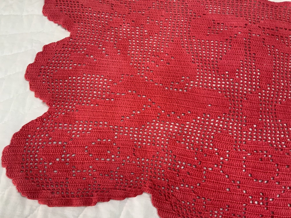 Up for sale is a vintage dresser scarf or table runner. The design is hand crocheted. Flower design. Cotton. The color is very dark pink, rosy red. Very pretty design. Scalloped edges. Very pretty design. Measures 25 1/2” by 15 1/2”. Please note*** The color on this item is not a true red. The pictures appear a darker color than it is. It is a rosy red, dark pink color. Very, Very Good condition. Hand made. Made in USA. 💗💗💗 Thank you and happy shopping. I will combine shipping charges. Smoke free home. Please make payment in three days. ~~~~🌹🌻🌷Please visit my eBay store: 🇺🇸webbsamericancountry1🇺🇸 for over 2000 vintage and collectible items. 🌺🌼🌹