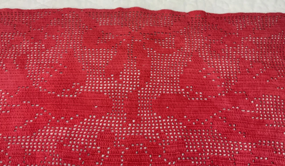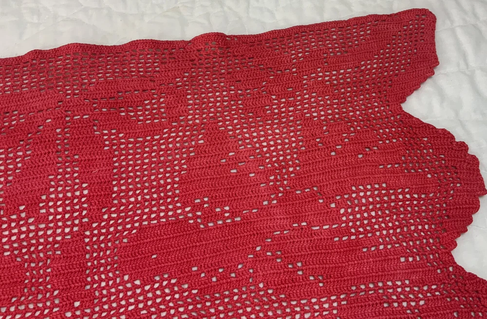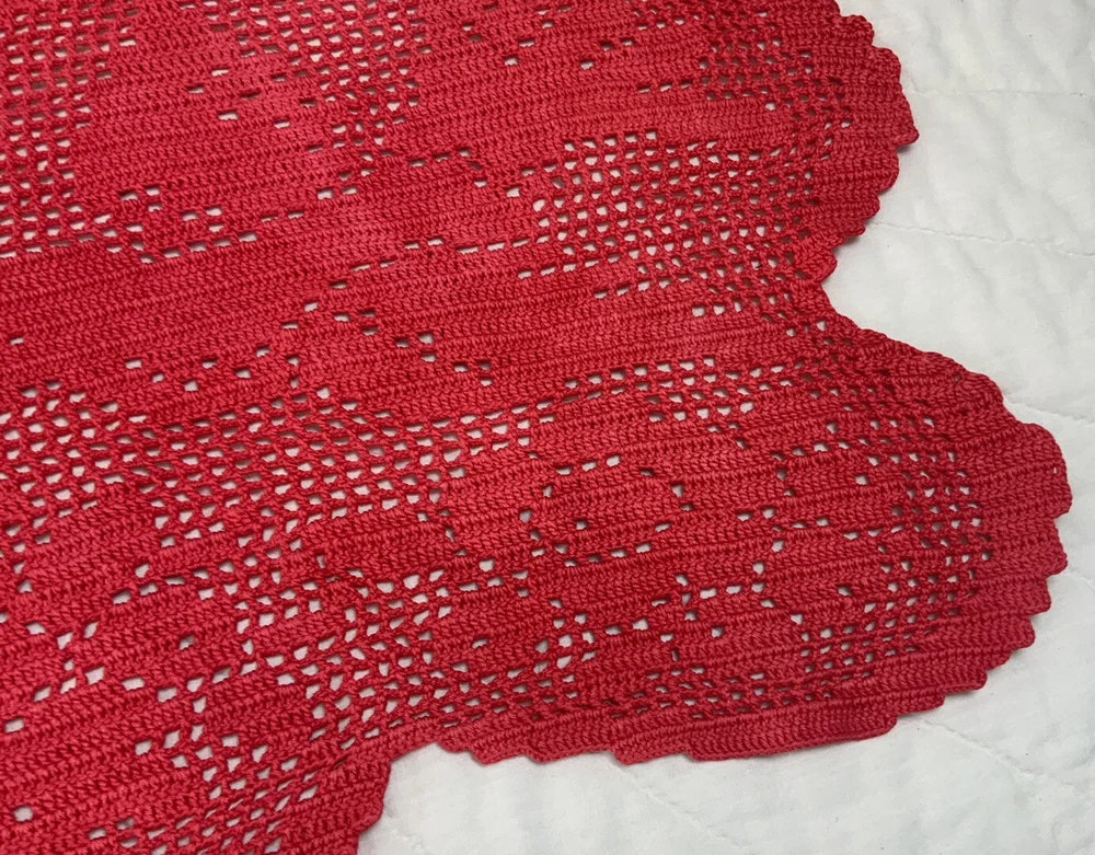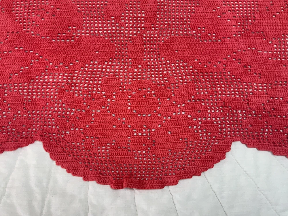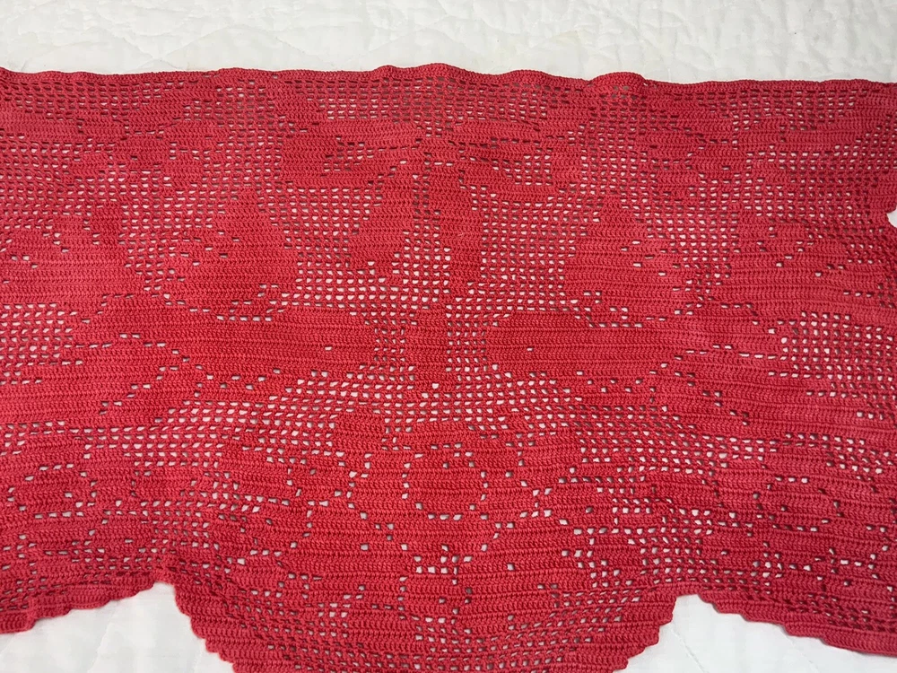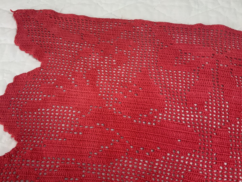 Up for sale is a vintage dresser scarf or table runner. The design is hand crocheted. Flower design. Cotton. The color is very dark pink, rosy red. Very pretty design. Scalloped edges. Very pretty design. Measures 25 1/2” by 15 1/2”. Please note*** The color on this item is not a true red. The pictures appear a darker color than it is. It is a rosy red, dark pink color. Very, Very Good condition. Hand made. Made in USA. 💗💗💗 Thank you and happy shopping. I will combine shipping charges. Smoke free home. Please make payment in three days. ~~~~🌹🌻🌷Please visit my eBay store: 🇺🇸webbsamericancountry1🇺🇸 for over 2000 vintage and collectible items. 🌺🌼🌹