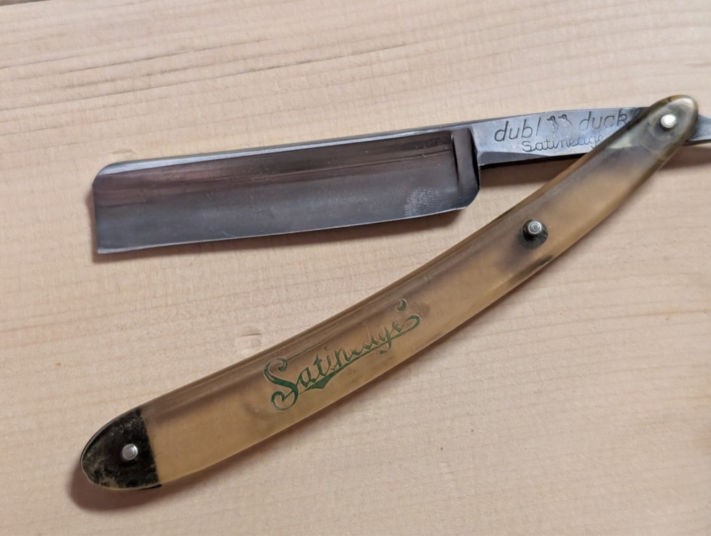 This vintage Dubl Duck Satinedge straight razor handle, made in Germany, is a sought-after collectible for shaving enthusiasts. Clear handle and very clear markings. Great condition.