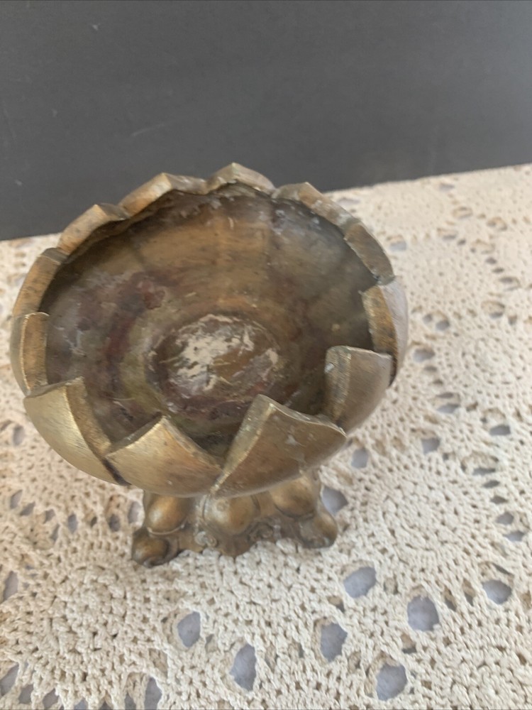 Lotus flower design. 6 “ tall 6” diameter. Has a gold antiqued matte finish. Typical vintage signs of wear and use. No chips or cracks. Candle not included.
