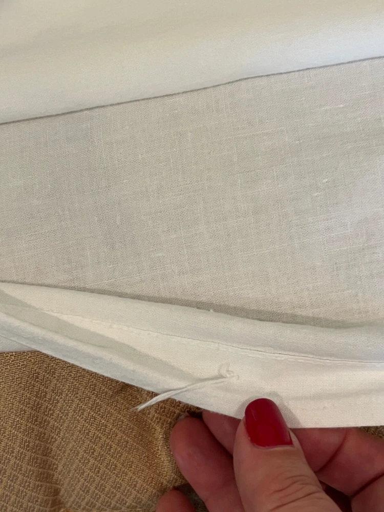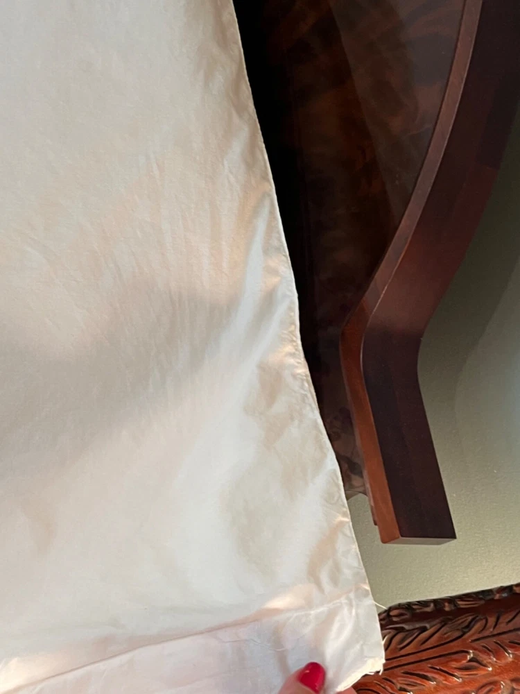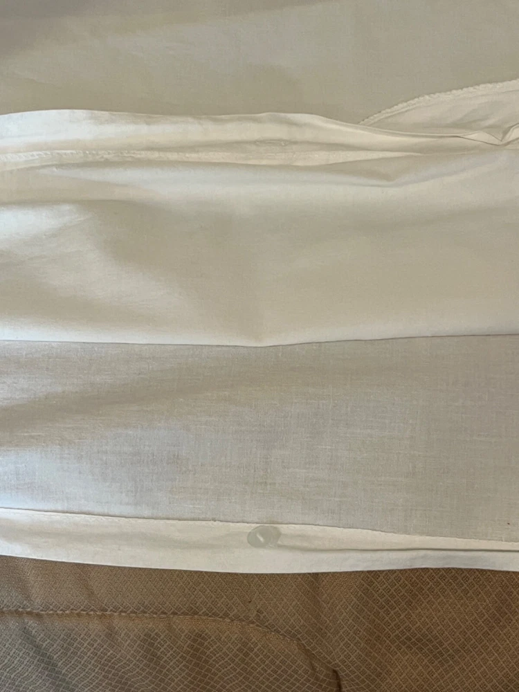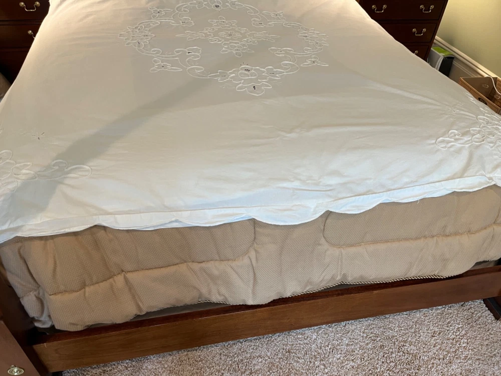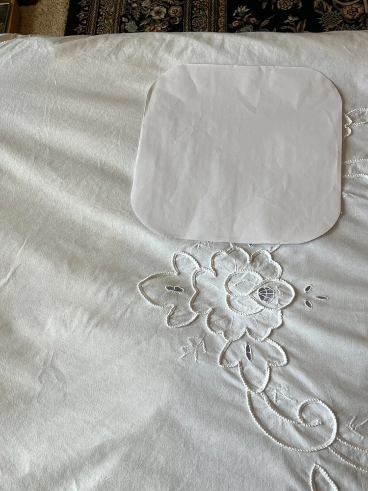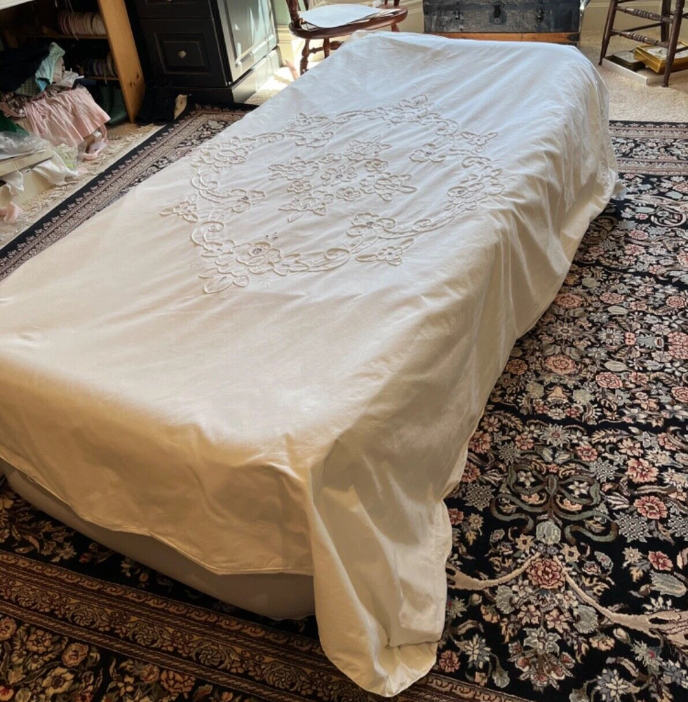Add a touch of vintage charm to your bedroom with this beautiful duvet cover. Featuring a floral pattern in chain-stitch embroidery and cutwork design, this rectangular cover is made of easy-care cotton material and measures 68 inches in width and 85 inches in length. The cover is machine washable and comes with buttons for easy closure. Ideal for a cottage or farmhouse-style bedroom, this duvet cover is perfect for those who appreciate embroidery and vintage decor. Pictured on both a twin air mattress and flat on a queen bed, this could work as a topper on a larger bed, or a close to complete cover on a twin. Some of the photos have a lavender piece of fabric inserted to show the pattern of cutwork better; this is for photographs only and not included in the listing. And there was a lot of shadow as I took photos; one picture has a piece of white paper to try to show that is is truly a bright white duvet cover. This is scalloped around 3 edges, including the open end at the foot. The closed end at the top of the bed is simply straight across.