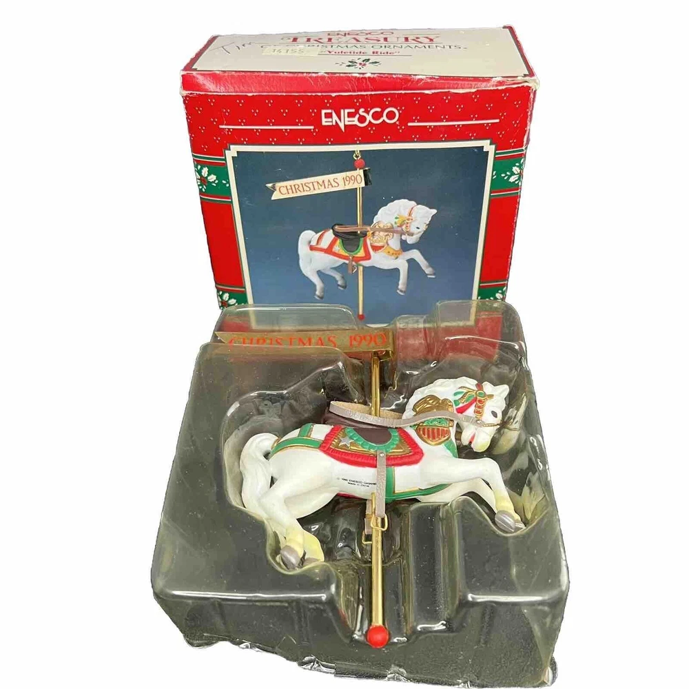 ENESCO vintage Christmas Tree Ornament of a 1990 Carousel horse from the "Christmas Carousel" series. Approximate Measurements: 4.5" x 4" Please see photos for more item details.