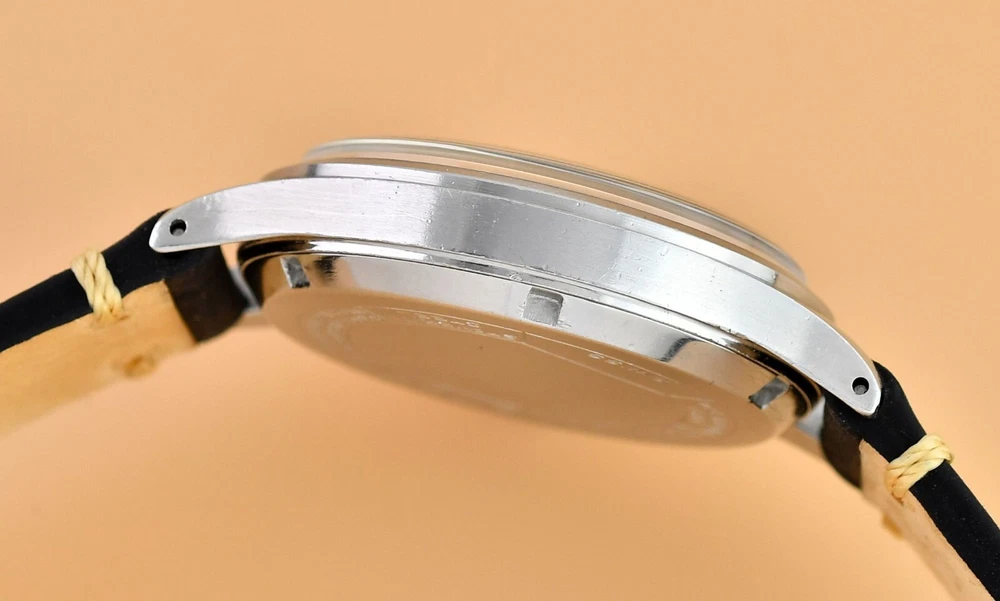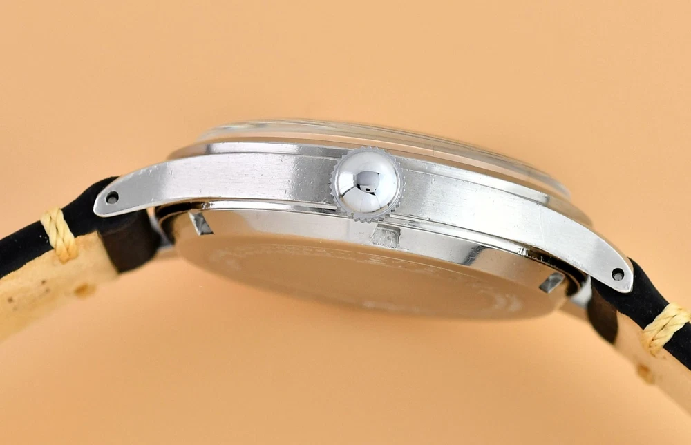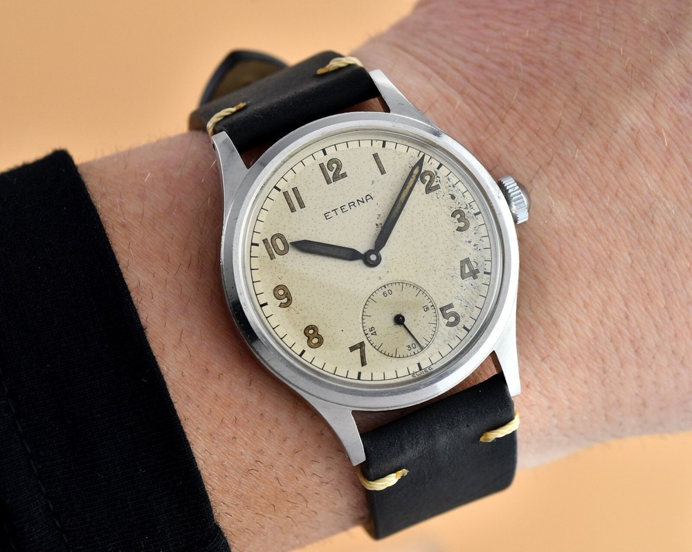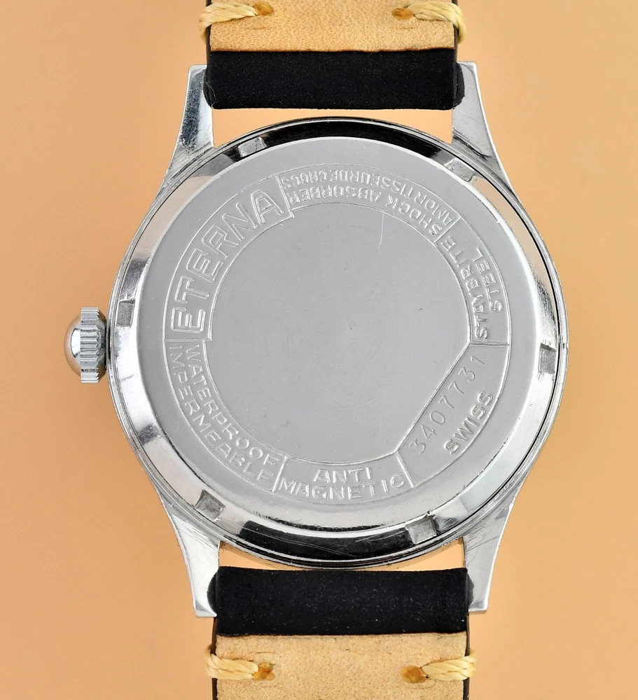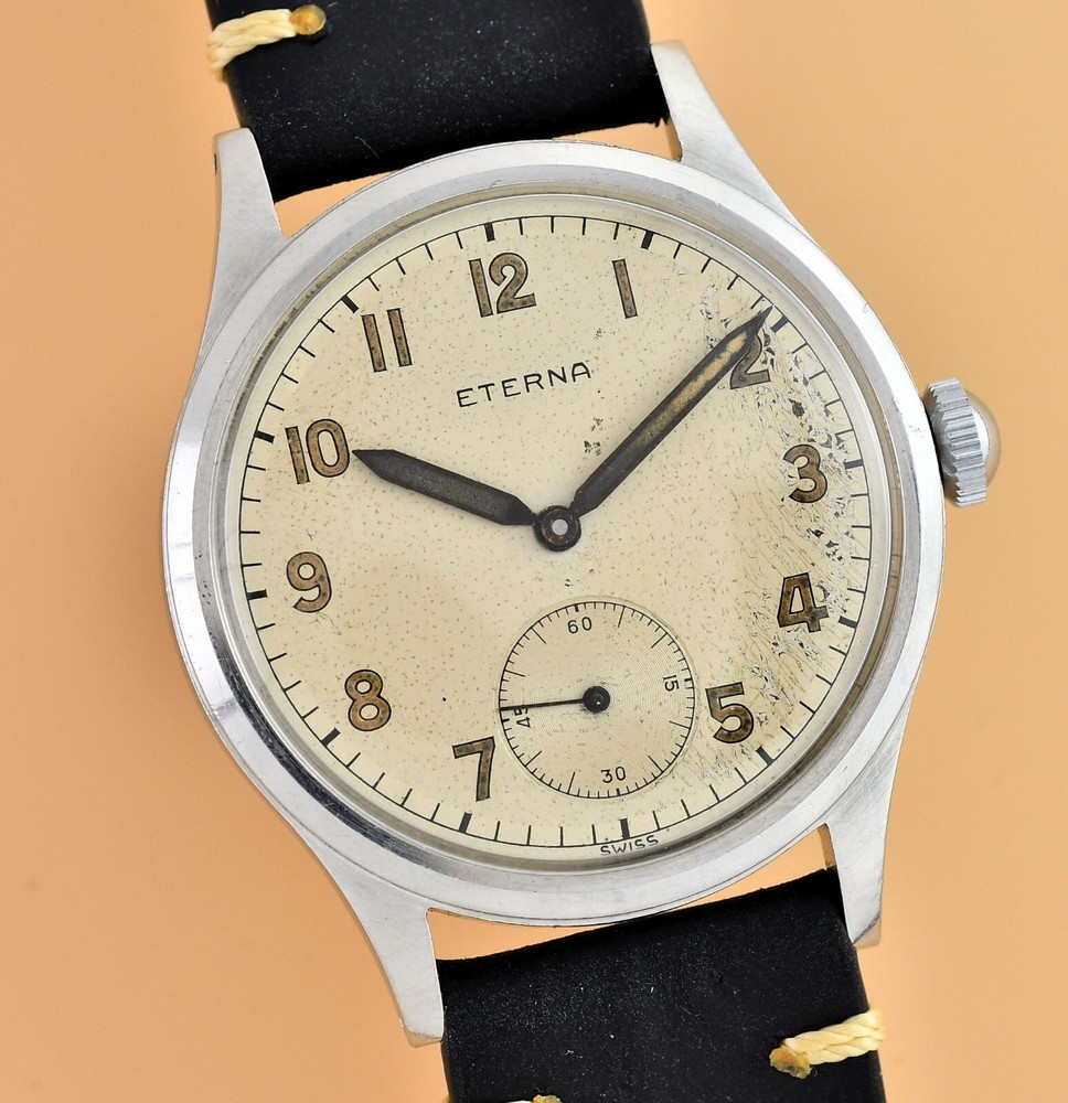 Up for sale is late 40's Eterna Jumbo. Original, unrestored dial in fair vintage condition. Original hands and dial lume. Unpolished stainless steel case with screw back. Movement Cal.852- hand wound in fully working order, keeps correct time. Cleaned and oiler recently. Brand new, genuine leather "vintage" strap included. Size: 36,5mm without the crown, 44mm lug to lug, takes 19mm strap. Free worldwide DHL Express insured delivery. All photos were taken by me. Happy bidding.