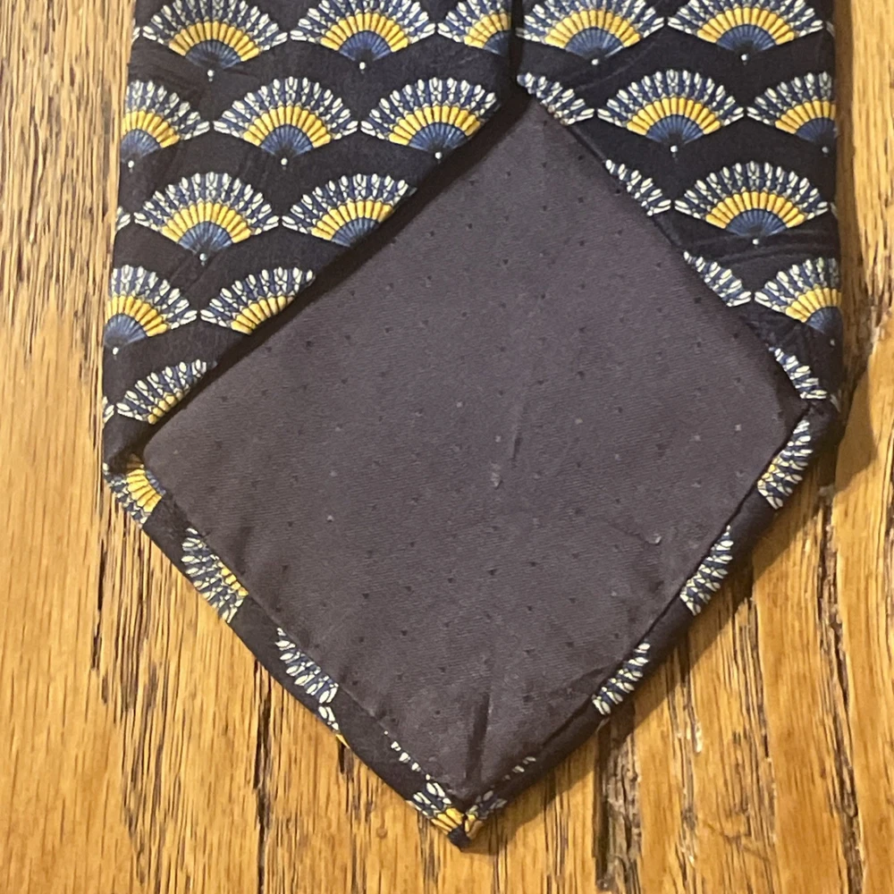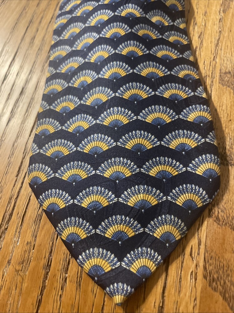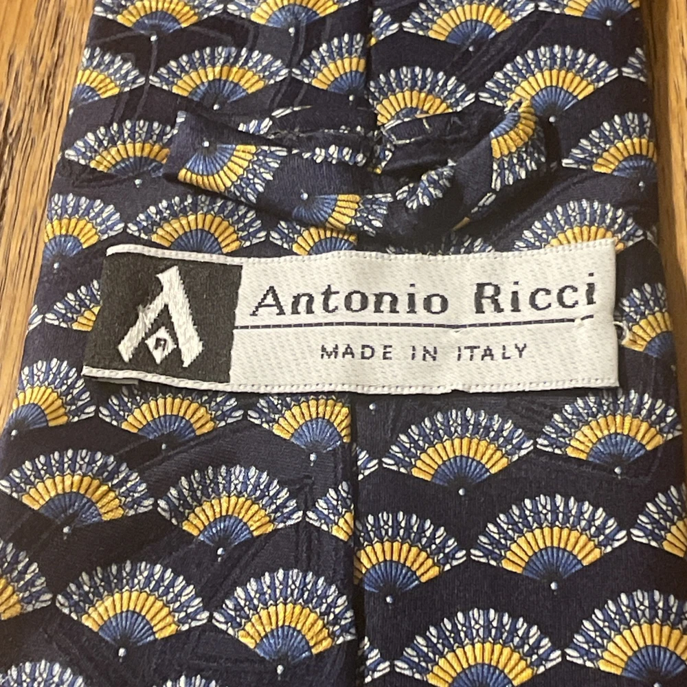 The Vintage EUC Antonio Ricci Geometric Fans Silk Tie Necktie is a high-quality designer accessory made in Italy. This multicolor tie features a classic geometric pattern, perfect for a preppy and sophisticated look. Made from 100% silk satin, this vintage piece exudes timeless elegance and style, making it a must-have for any man's wardrobe.