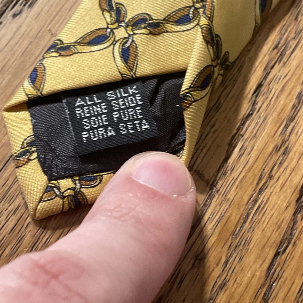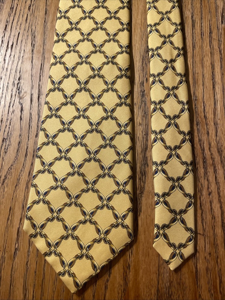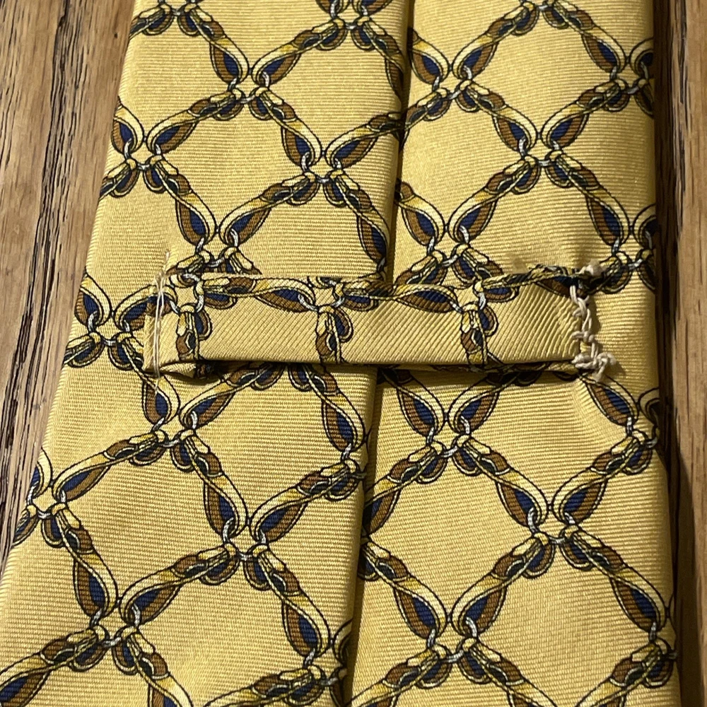 The Vintage Burberry Geometric Gold Links Silk Tie Necktie is a luxurious and stylish accessory for men. Made in England from 100% silk satin, this designer tie features a classic geometric pattern in multicolor. The vintage piece exudes a timeless elegance and sophistication, perfect for adding a touch of prestige to any formal outfit.