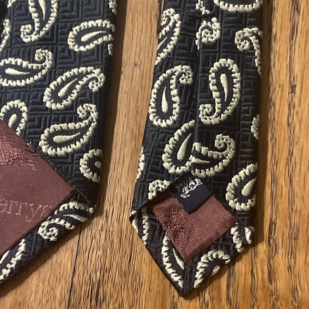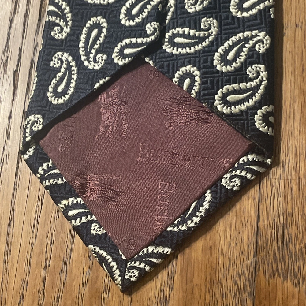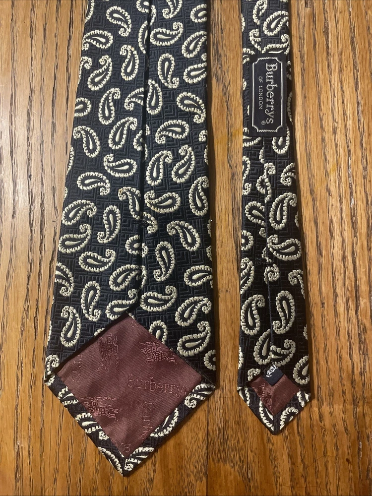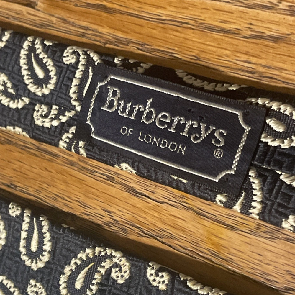 This vintage Burberry woven silk paisley tie is a classic men's accessory hand-sewn in the USA. The multicolor design, featuring a preppy paisley pattern, adds a touch of designer style to any outfit. Made from 100% silk, this tie is a luxurious and timeless piece that exudes sophistication and elegance. Perfect for adding a unique and stylish flair to a man's wardrobe.