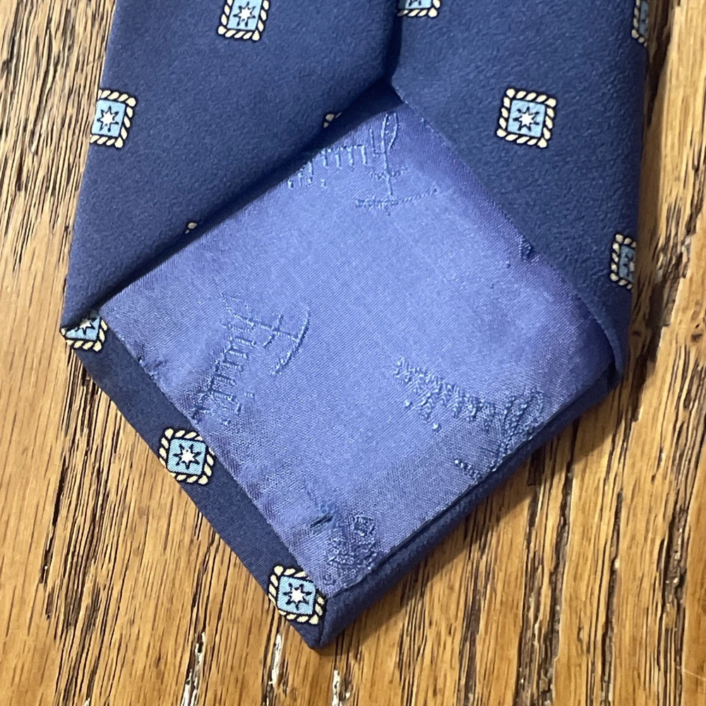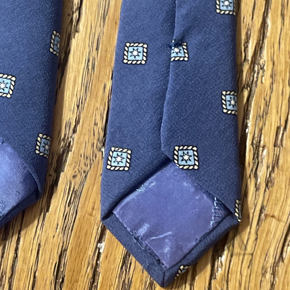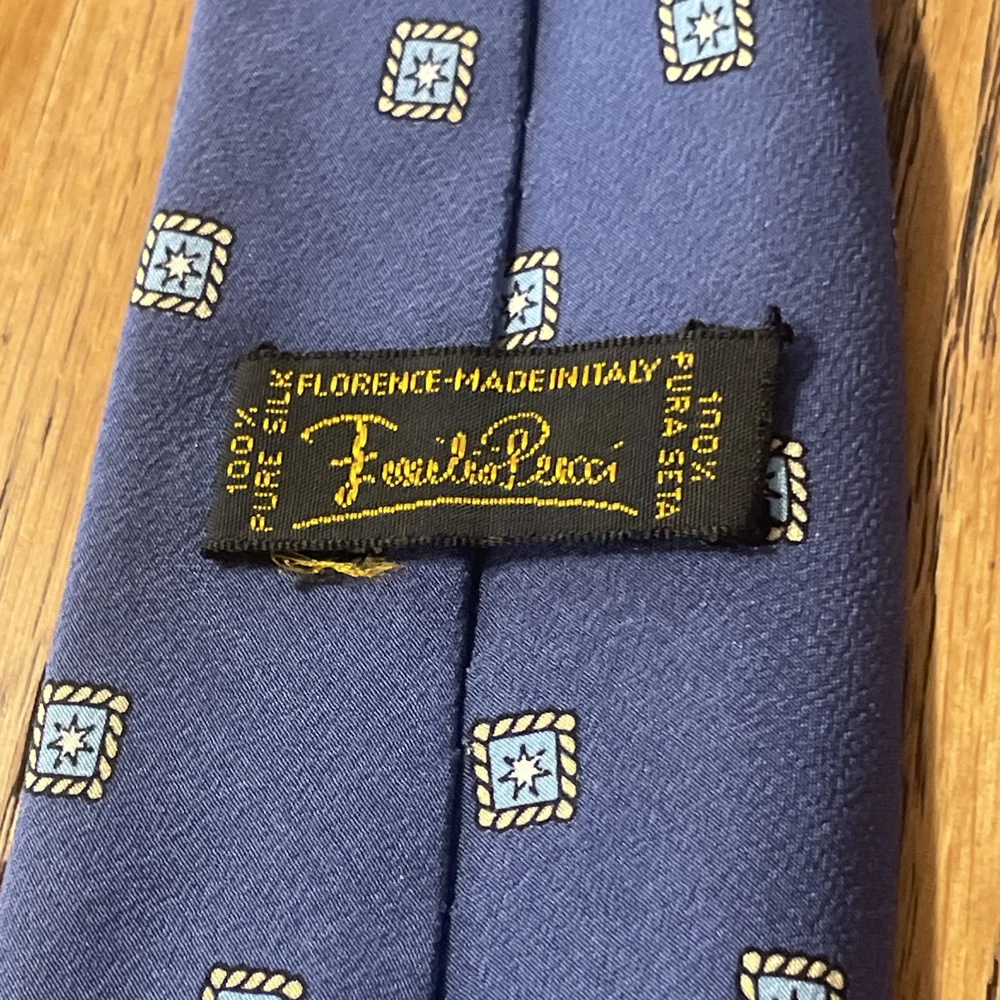 This Vintage Emilio Pucci Geometric Foulard Silk Tie is a classic and preppy designer accessory for men. Made in Italy from 100% silk satin, this multicolor tie features a semi-skinny width and a distinctive geometric Foulard pattern. The vintage nature of the item adds a touch of elegance and sophistication to any formal or professional outfit, making it a timeless piece for any man's wardrobe. Little bit of gentle wrinkling around the knot, but not bad at all, very minor.