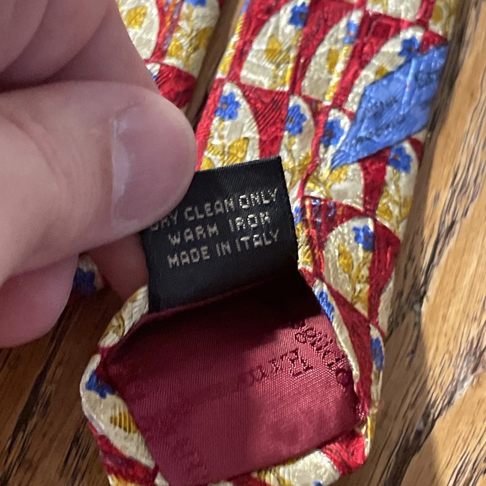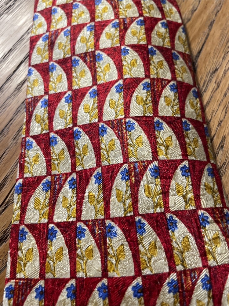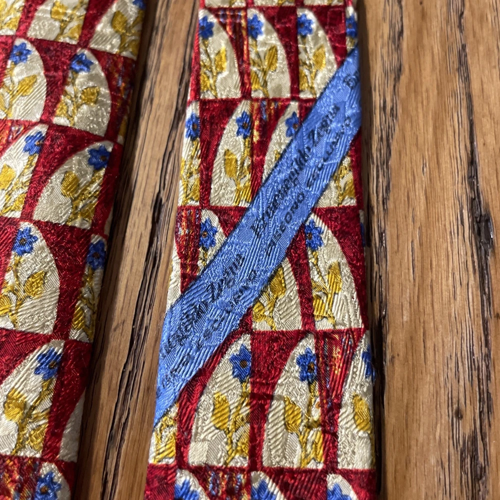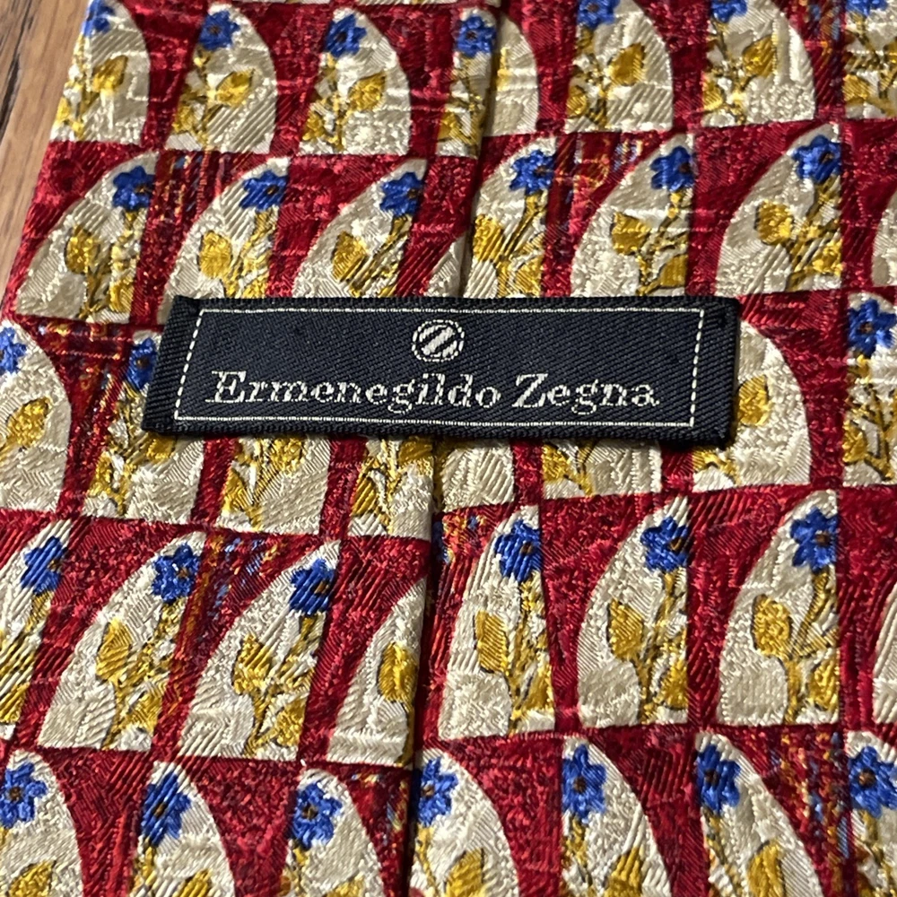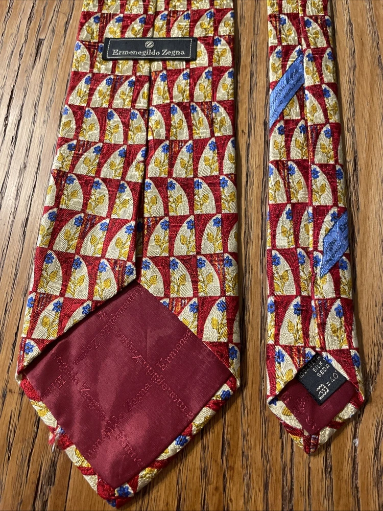 This vintage Ermenegildo Zegna silk tie is a classic and sophisticated accessory for men. Made in Italy, the tie features a geometric floral pattern in a multicolor design, perfect for adding a touch of preppy style to any outfit. Crafted from 100% silk jacquard fabric, this designer tie exudes luxury and elegance, making it a timeless piece for any man's wardrobe. See pics - beautiful tie but it has a little flaw along the edge of the blade, some abrasion to the fabric. If you were to trim up the threads even with the edge again, it likely will come out looking great and not be a very noticeable flaw.
