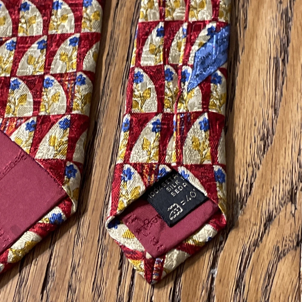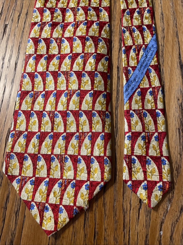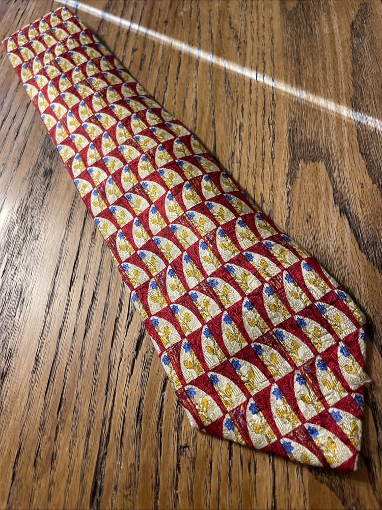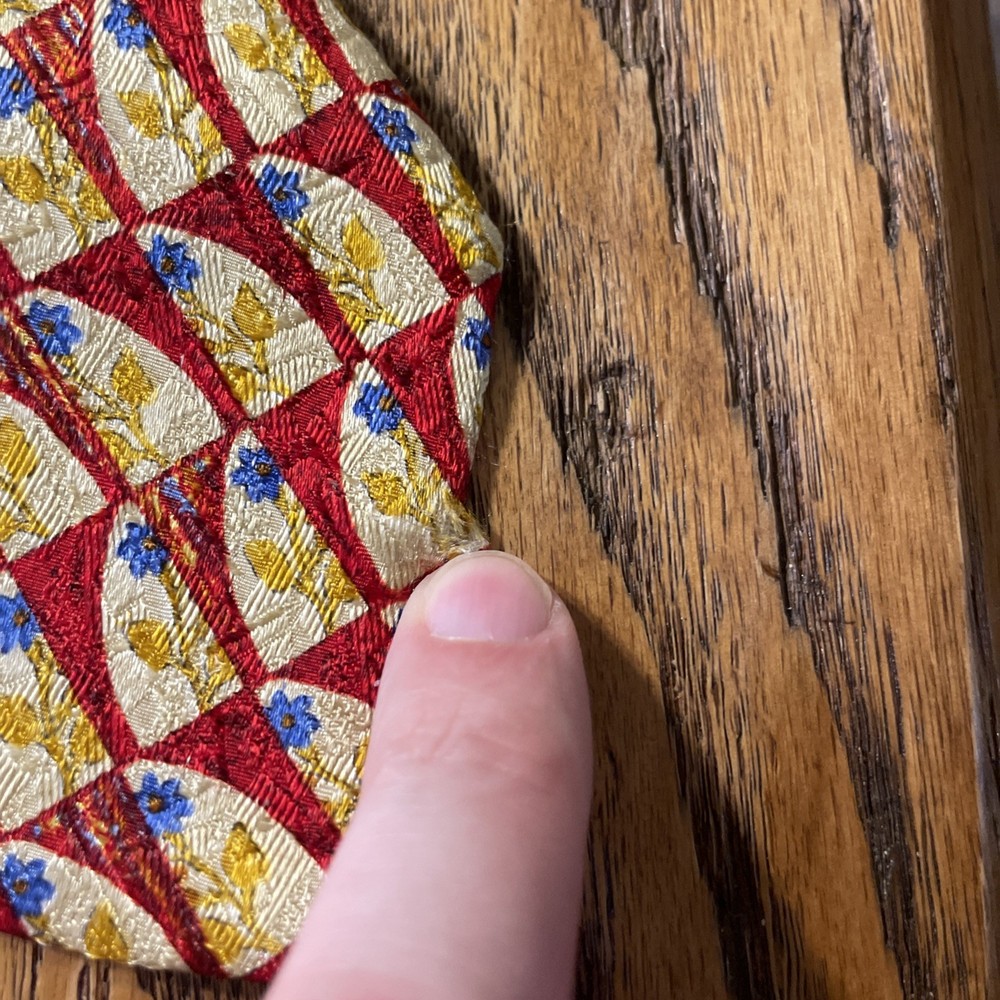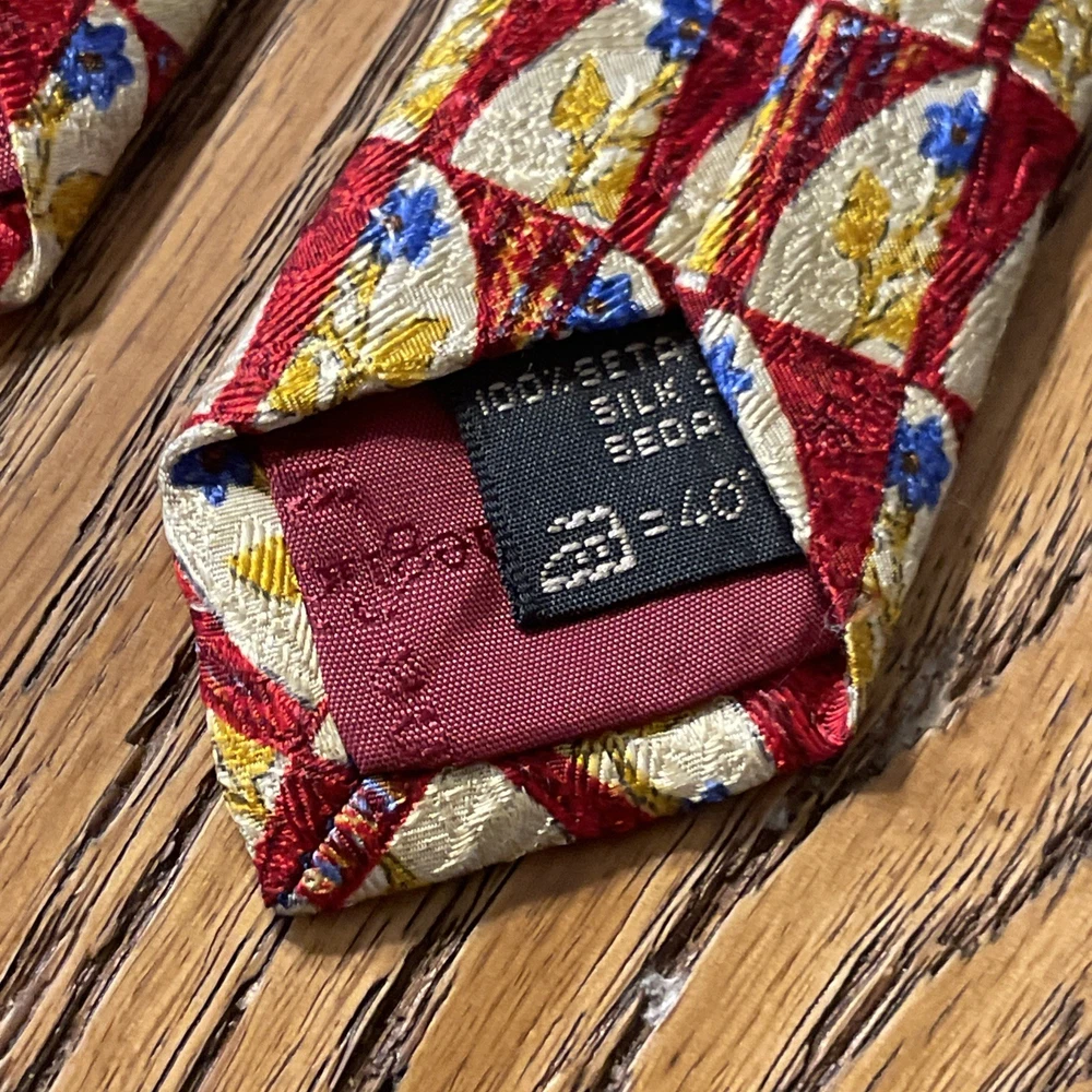 This vintage Ermenegildo Zegna silk tie is a classic and sophisticated accessory for men. Made in Italy, the tie features a geometric floral pattern in a multicolor design, perfect for adding a touch of preppy style to any outfit. Crafted from 100% silk jacquard fabric, this designer tie exudes luxury and elegance, making it a timeless piece for any man's wardrobe. See pics - beautiful tie but it has a little flaw along the edge of the blade, some abrasion to the fabric. If you were to trim up the threads even with the edge again, it likely will come out looking great and not be a very noticeable flaw.