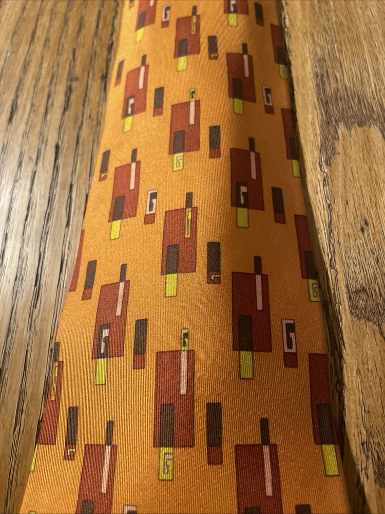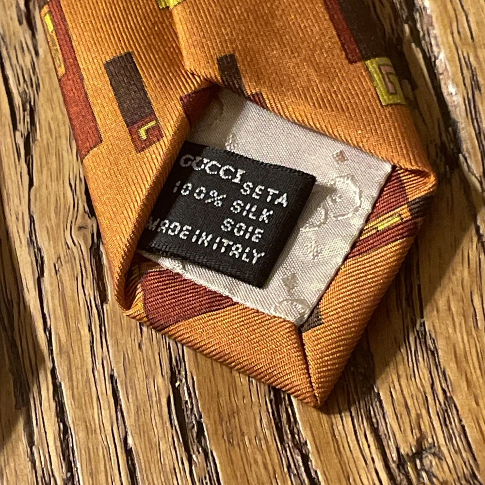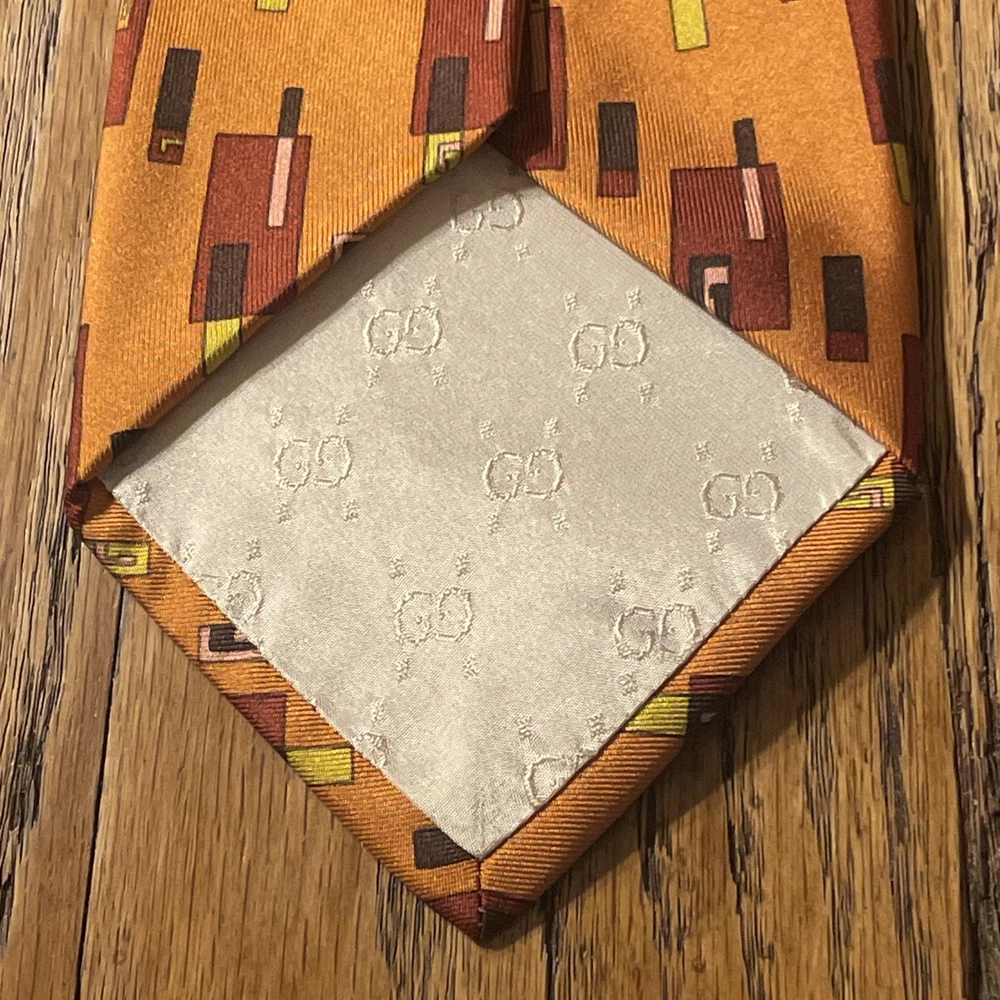 This vintage Gucci tie features a unique geometric pop art G logo design, made in Italy from 100% silk satin fabric. The multicolor tie is classic in width, adding a touch of designer style to any man's accessory collection. Perfect for those who appreciate high-end fashion and timeless pieces from a renowned brand like Gucci.