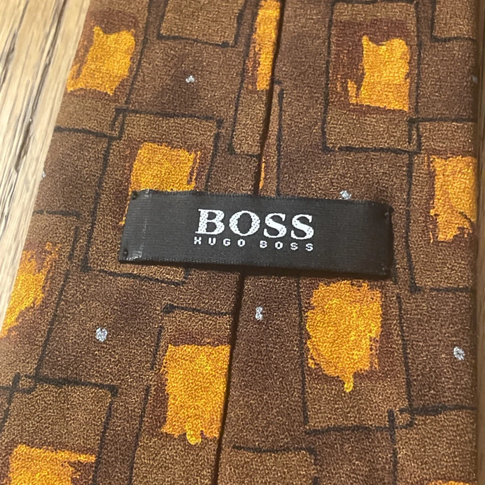 This vintage Hugo Boss geometric silk tie is a classic accessory for men, featuring a sophisticated design made in Italy. The multicolor geometric pattern adds a touch of designer style to any outfit, with a luxurious feel from the 100% satin silk material. Perfect for adding a timeless touch to a formal or professional look, this necktie exudes elegance and quality craftsmanship from a renowned brand like Hugo Boss.