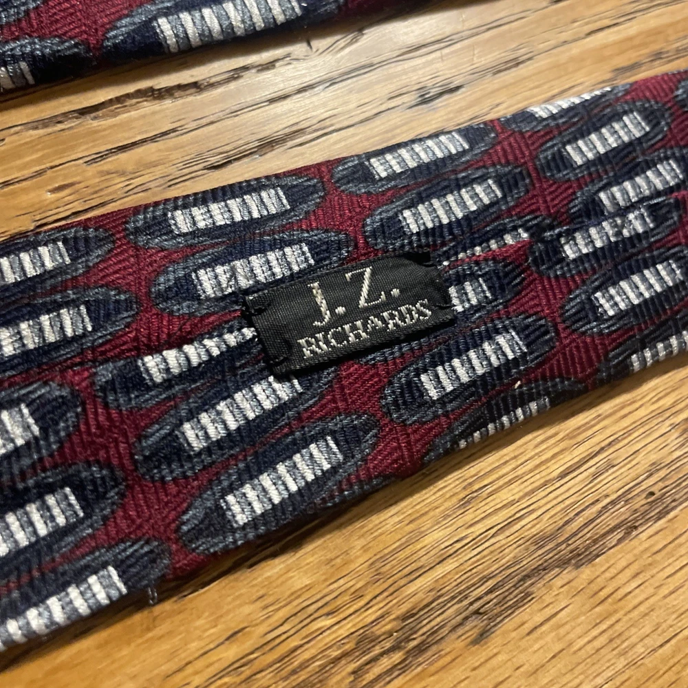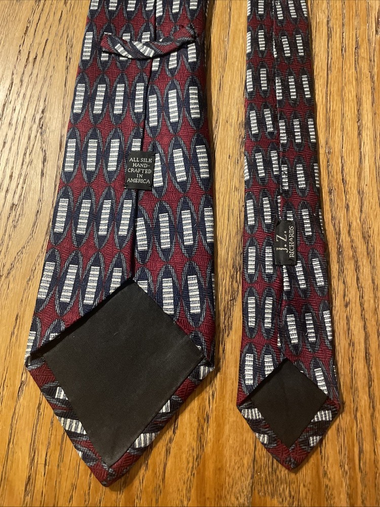 This vintage J.Z. Richards hand-made silk tie necktie features a classic geometric pattern in a multicolor design, perfect for men looking to add a touch of preppy style to their outfit. Made from 100% satin silk in the United States, this designer tie exudes quality and sophistication. With its timeless appeal and unique handmade craftsmanship, this tie is a standout accessory for any man's collection.