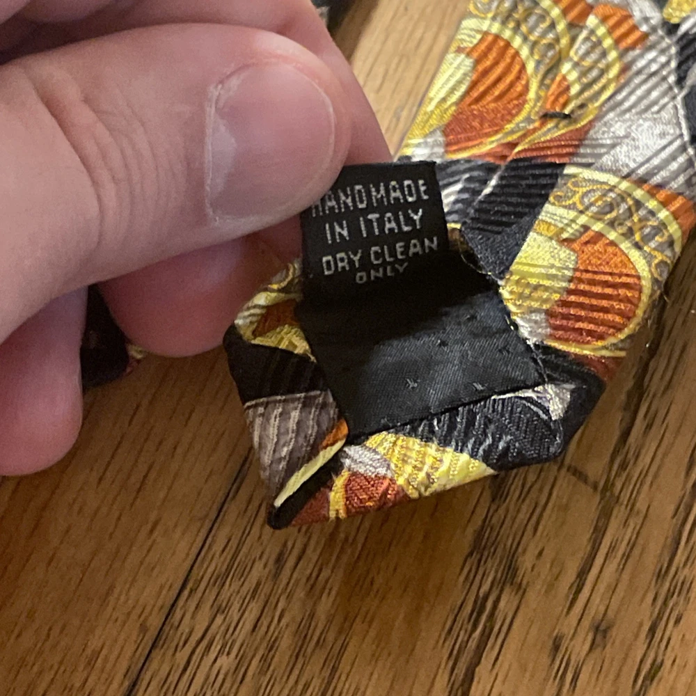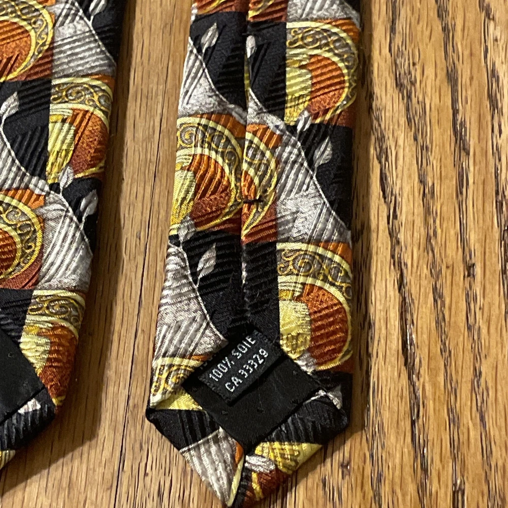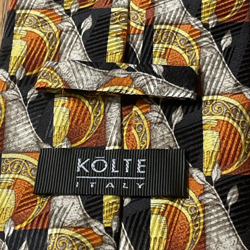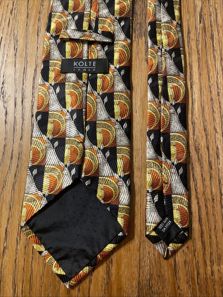 The Vintage EUC Kolte Geometric Baroque Silk Tie is a designer accessory for men, hand-made in Italy from 100% satin silk. The tie features a classic width with a multicolor Baroque geometric pattern, perfect for adding a touch of preppy charm to any formal outfit. This high-quality, vintage piece is sure to make a stylish statement with its unique design and luxurious material.