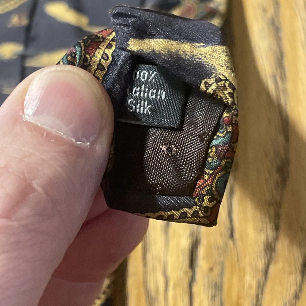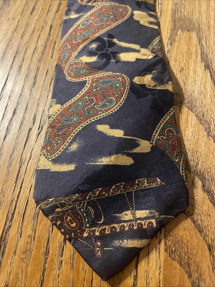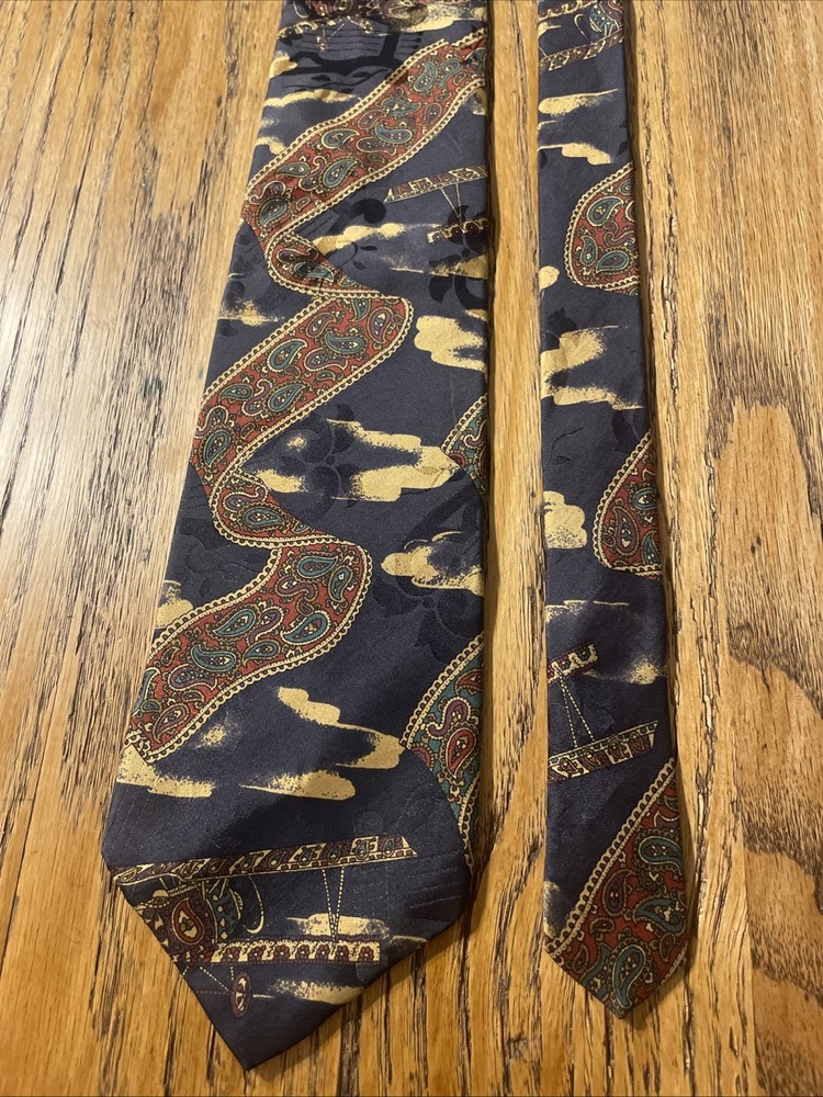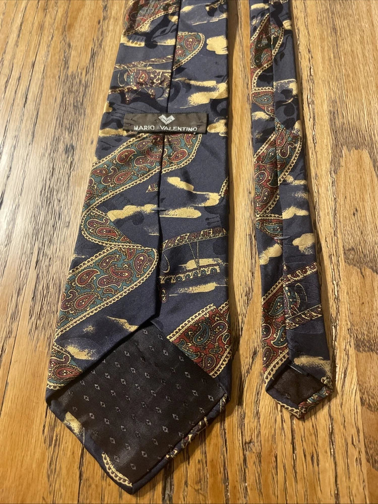 The Vintage EUC Mario Valentino Abstract Paisley Silk Tie Necktie is a high-quality men's accessory made in the USA. This preppy designer tie features a classic width and is crafted from 100% silk satin material. The abstract paisley pattern adds a unique and stylish touch to any formal outfit, making it a versatile and timeless piece for any man's wardrobe. Perfect for adding a touch of vintage flair to a classic look.