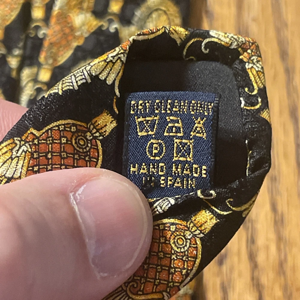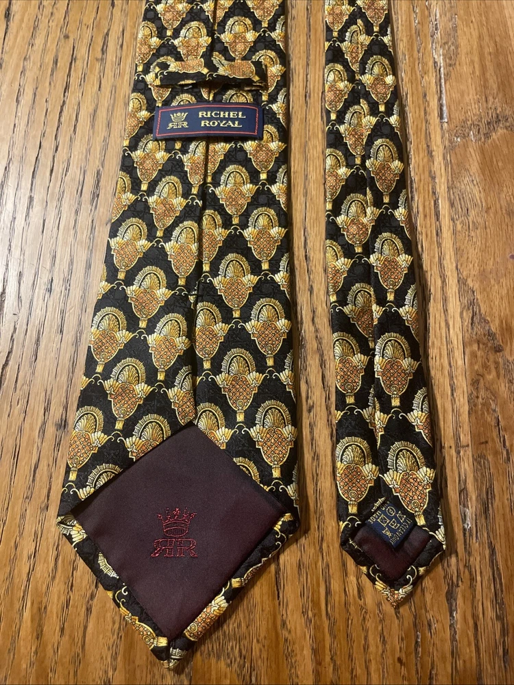 This Vintage EUC Michel Royal Baroque Geometric Silk Tie Necktie is a designer accessory for men, hand-made in Spain by the Richel Royal brand. The multicolor Baroque pattern on 100% silk satin fabric exudes a preppy and sophisticated style. With a classic width, this tie is perfect for adding a touch of vintage elegance to any formal ensemble. Made with quality and attention to detail, this necktie is sure to elevate any outfit with its timeless and intricate design.