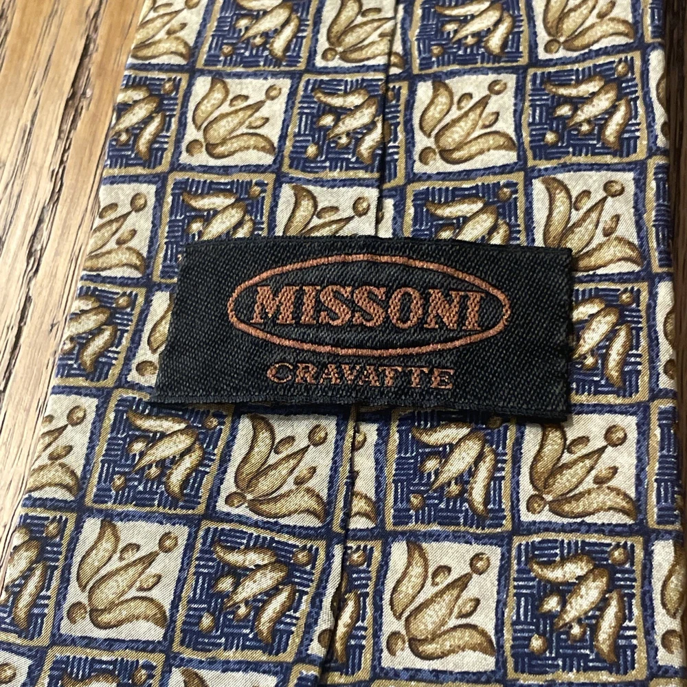 The product is a vintage Missoni Cravatte geometric silk tie, designed for men with a classic and preppy style. Made in Japan, this multicolored tie features a geometric pattern on satin fabric, embodying designer quality and sophistication. Perfect for adding a touch of vintage charm to any formal or professional outfit, this tie is a timeless accessory that showcases quality craftsmanship and a distinctive aesthetic.