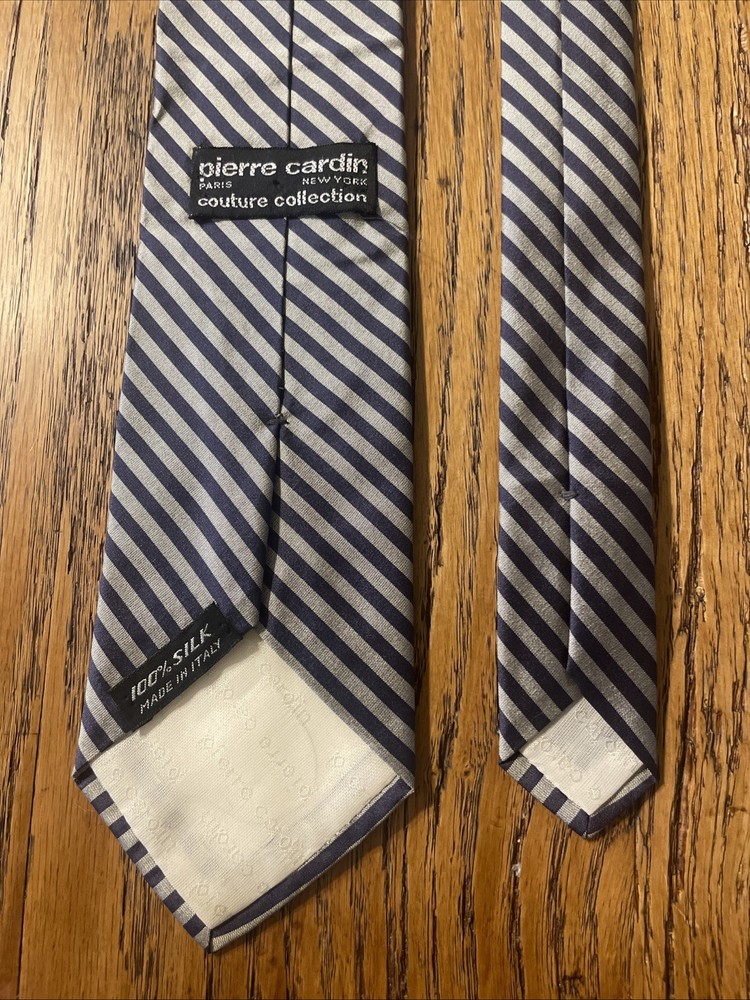 This Vintage Pierre Cardin Couture Striped Tie is a luxurious men's necktie made in Italy from 100% silk satin. The classic multicolored design exudes a preppy style, perfect for adding a touch of sophistication to any formal outfit. With its designer brand and vintage appeal, this tie is a high-quality and versatile accessory for the modern gentleman.