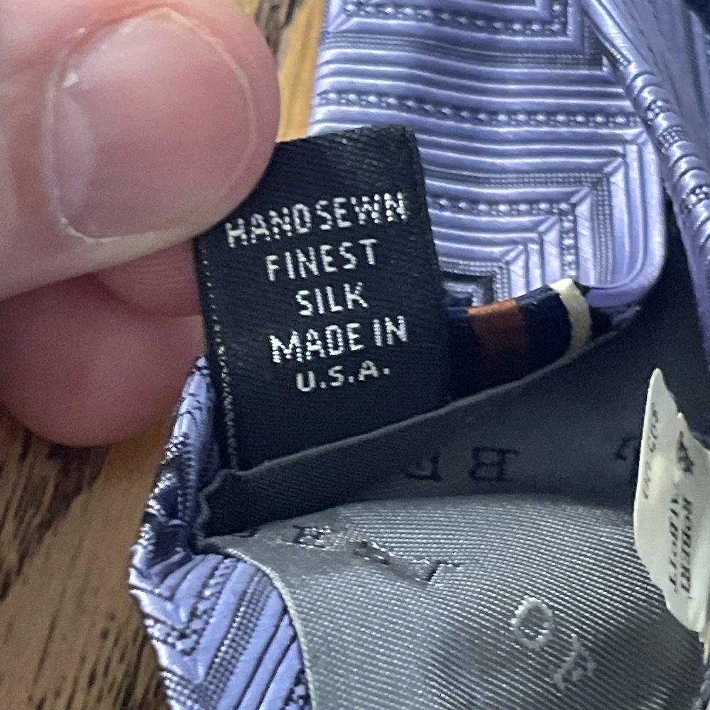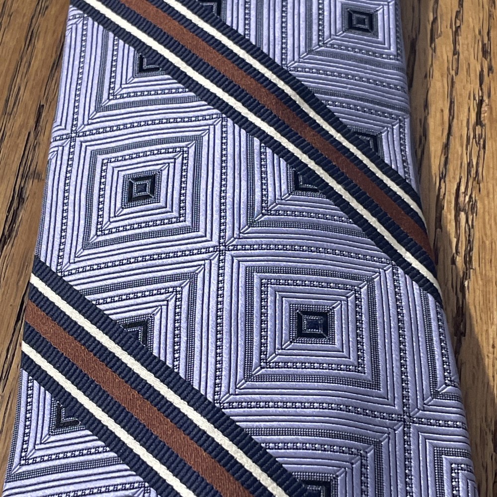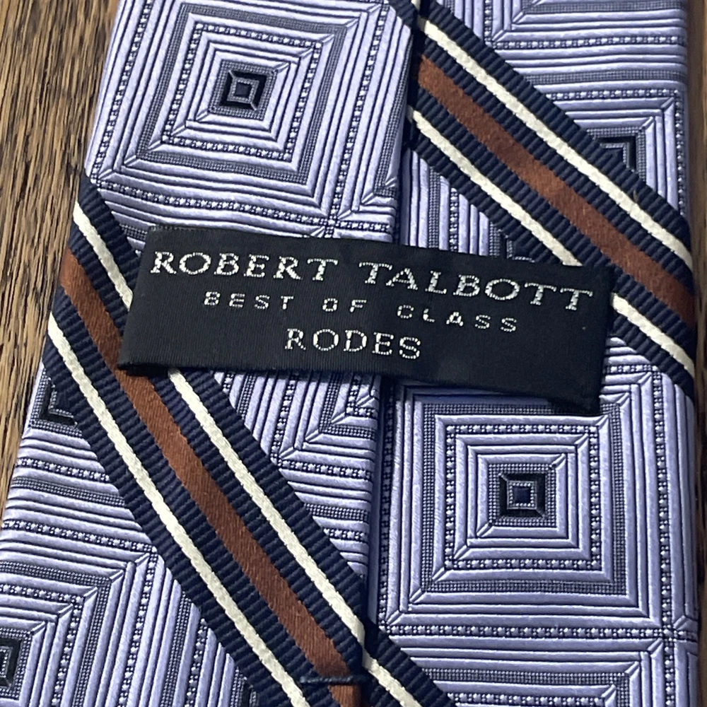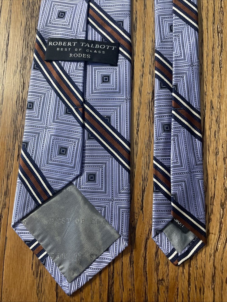 This Vintage EUC Robert Talbott Best Of Class Silk Tie is a designer accessory perfect for any men's formal or professional outfit. Made in the USA with 100% silk fabric, this woven tie features a geometric striped pattern in multicolor. The hand-sewn details and classic width make it a timeless piece that embodies craftsmanship and style.