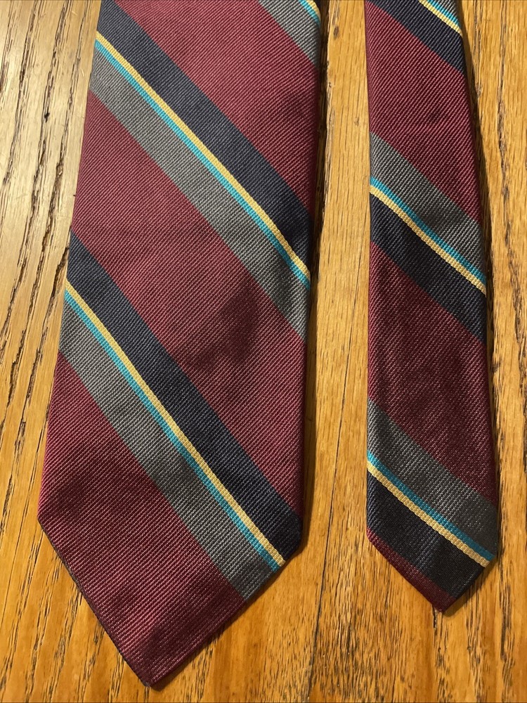 This vintage Robert Talbott Damschroder's Repp Silk Tie is a classic designer necktie made in the USA. Hand sewn from 100% silk fabric with a regimental stripe pattern, this multicolor tie exudes a sophisticated and timeless style. Perfect for adding a touch of luxury to any man's outfit, this necktie is a rare find for those who appreciate high-quality craftsmanship and heritage in their accessories.