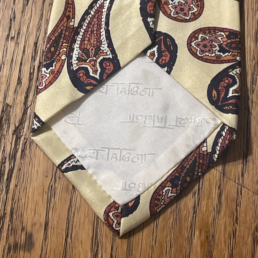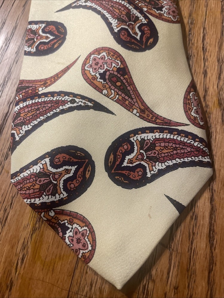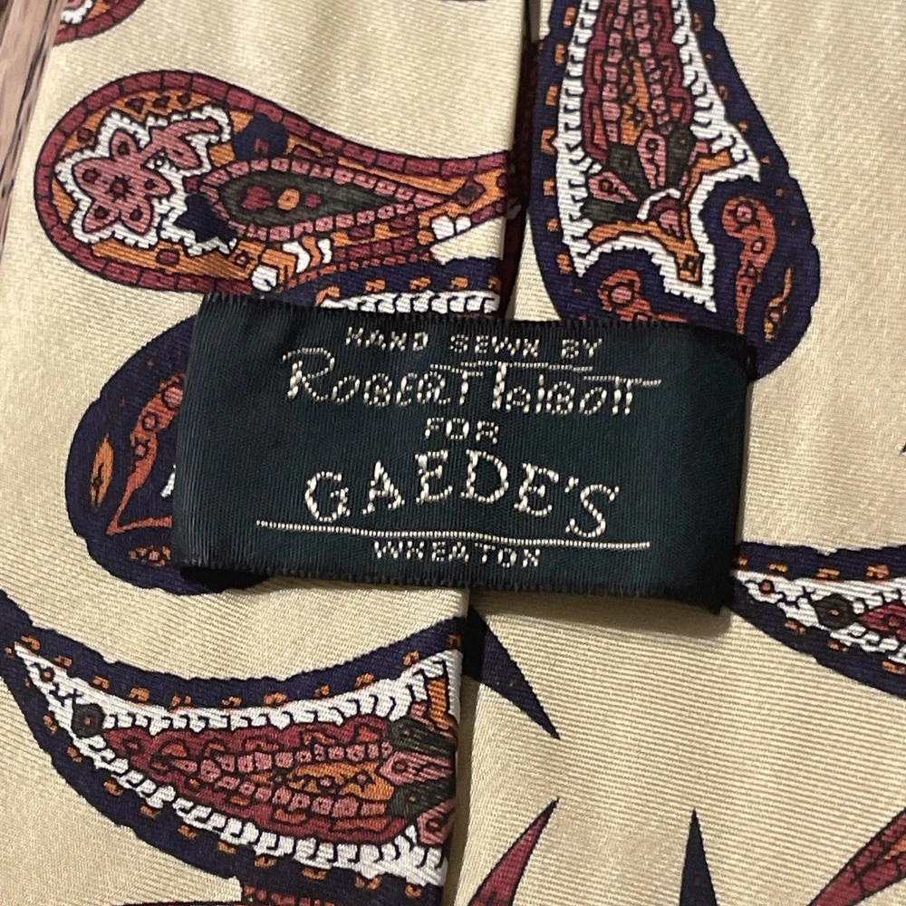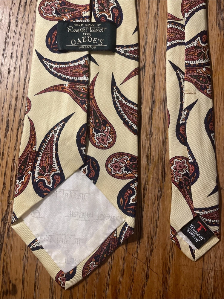 The product is a vintage Robert Talbott for Gaede's silk paisley tie, hand sewn in the USA. This classic designer necktie features a preppy multicolor paisley pattern on satin fabric, making it a stylish accessory for men. The tie's high-quality 100% silk material and intricate hand-sewn construction add a touch of sophistication to any outfit. Perfect for adding a unique and timeless touch to any professional or formal ensemble.
