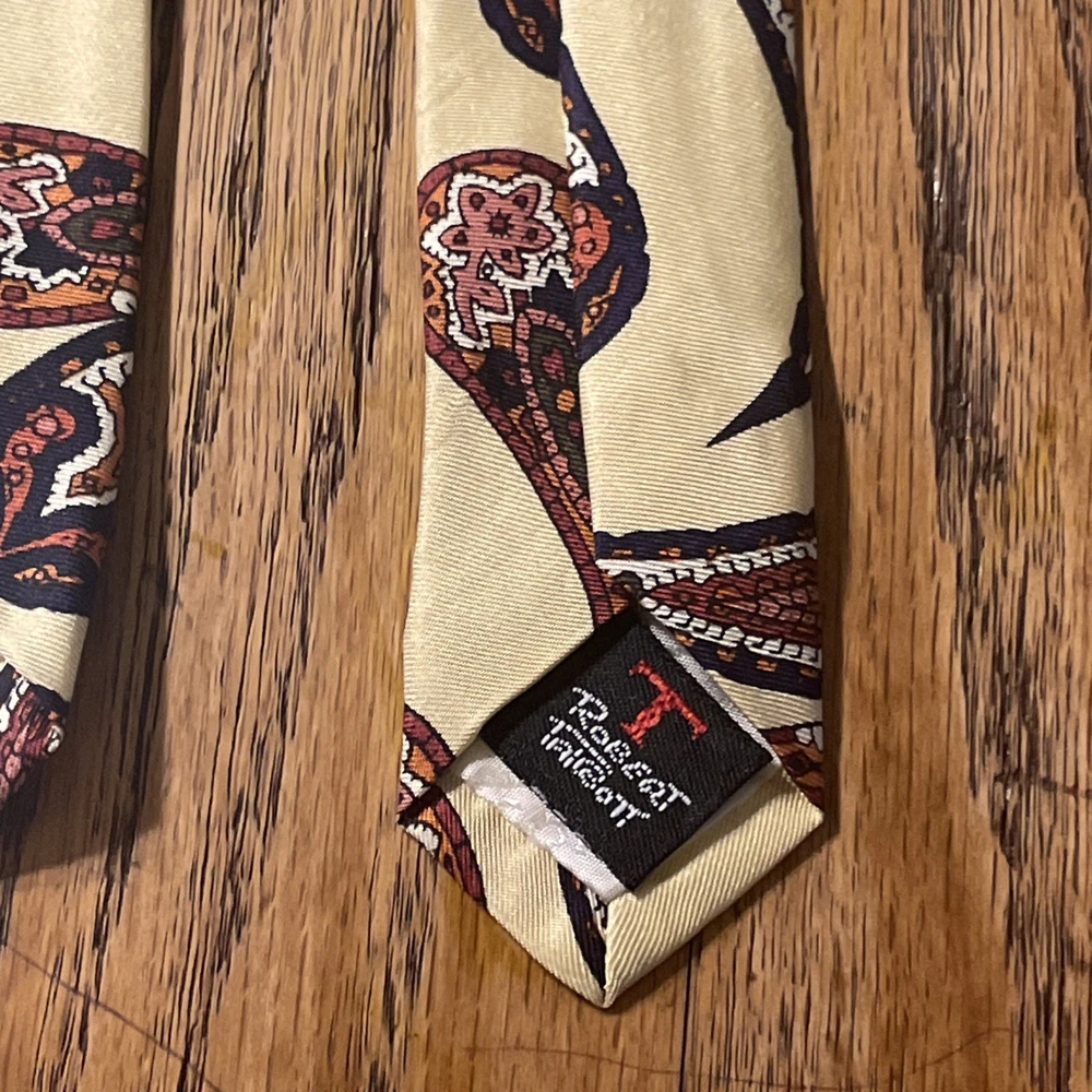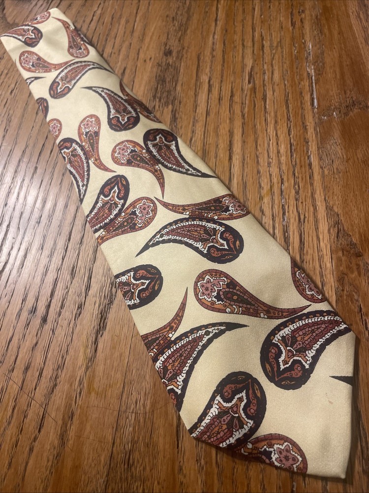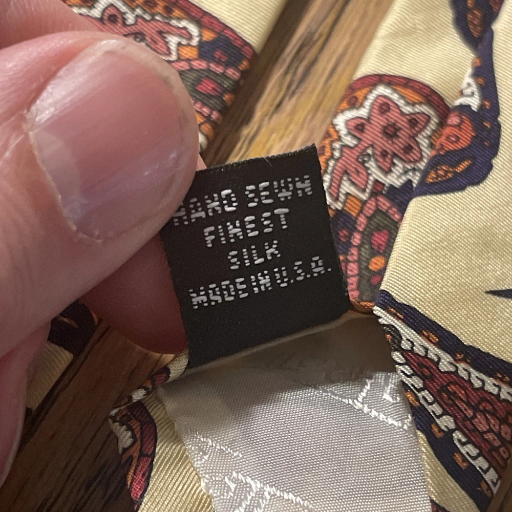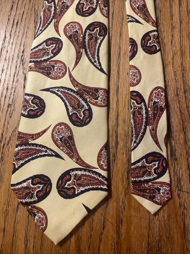 The product is a vintage Robert Talbott for Gaede's silk paisley tie, hand sewn in the USA. This classic designer necktie features a preppy multicolor paisley pattern on satin fabric, making it a stylish accessory for men. The tie's high-quality 100% silk material and intricate hand-sewn construction add a touch of sophistication to any outfit. Perfect for adding a unique and timeless touch to any professional or formal ensemble.