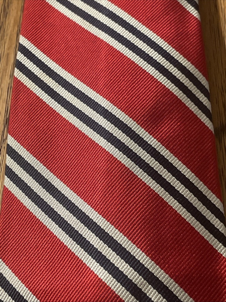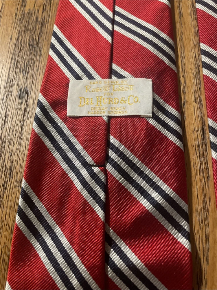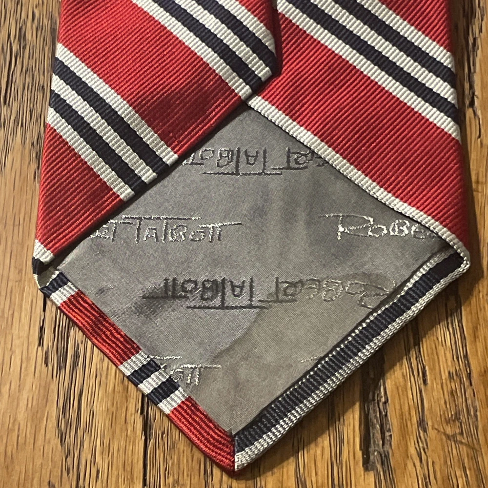 The product is a vintage Robert Talbott Repp Silk Striped Tie, hand-sewn in the USA. This designer tie features a classic multicolor striped pattern on 100% silk fabric, embodying a timeless and sophisticated style. Perfect for adding a touch of vintage charm to any man's wardrobe, this tie showcases the brand's commitment to quality craftsmanship and unique design.