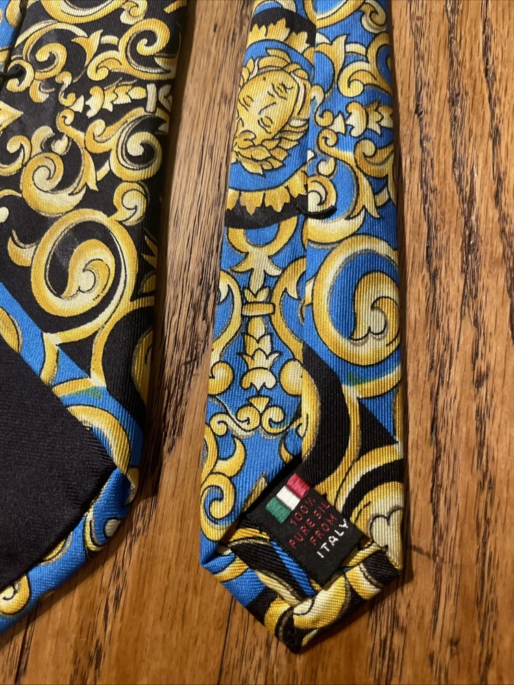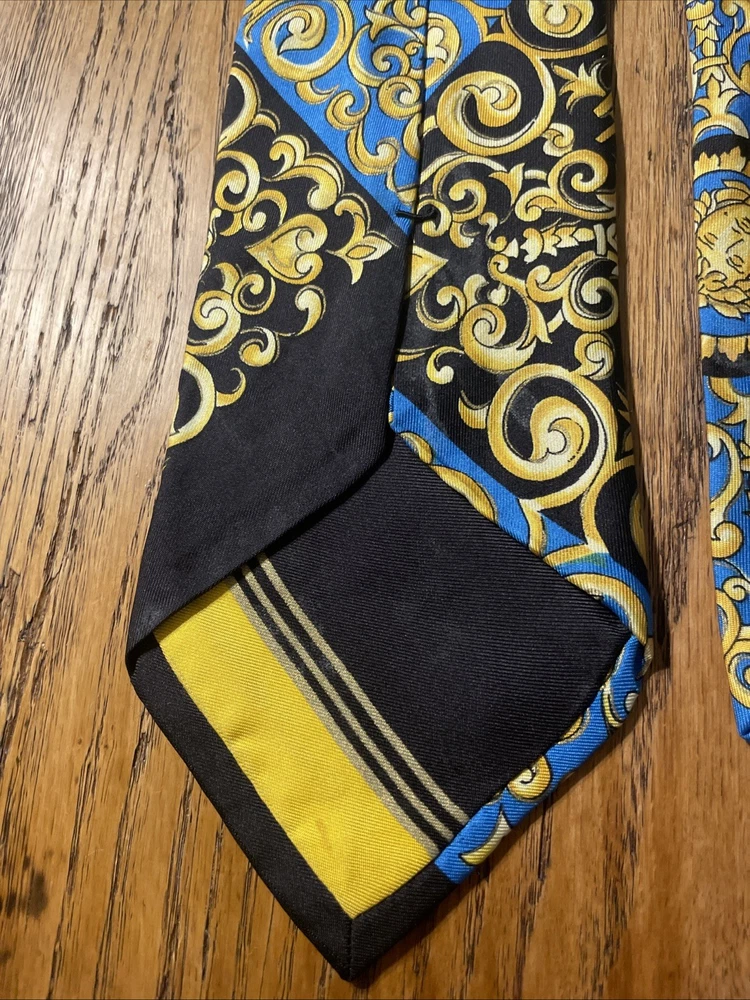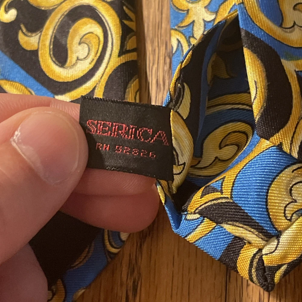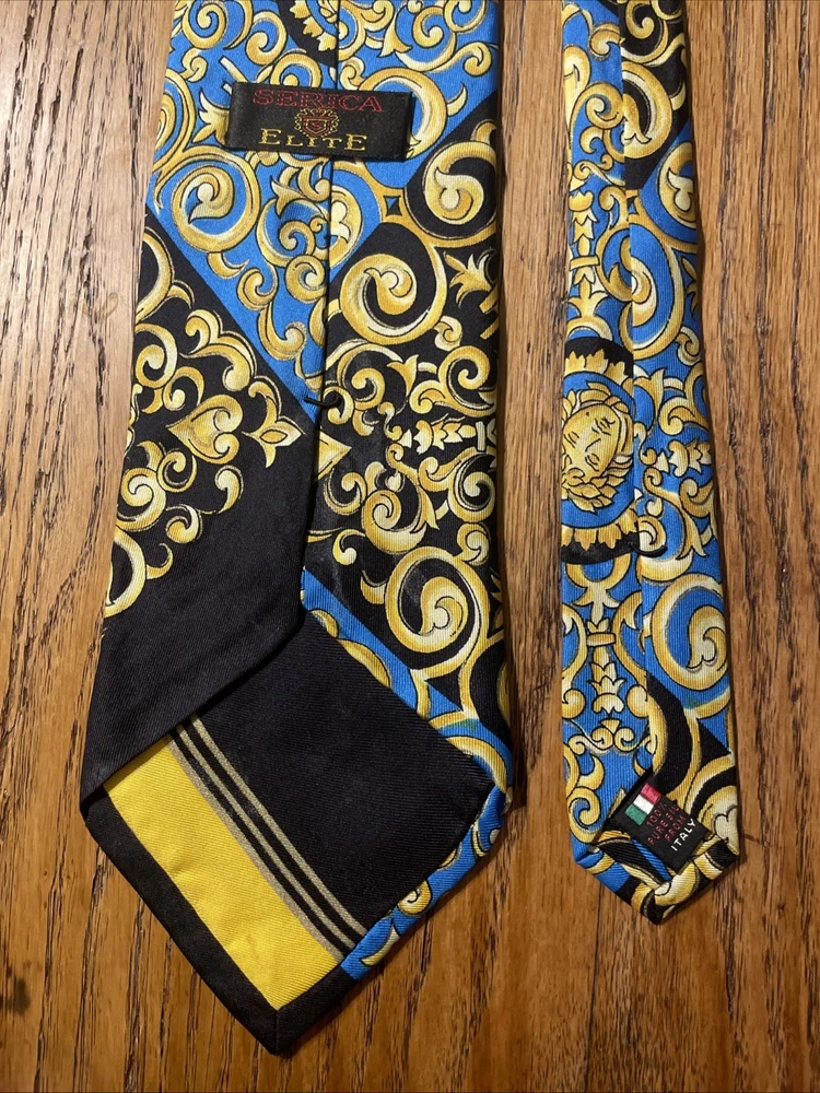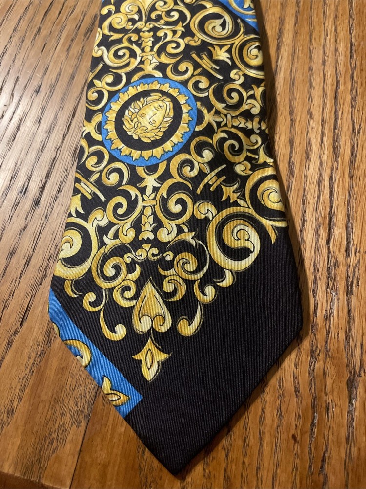 The Vintage Serica Elite Medusa Head Geometric Silk Tie is a luxurious and designer accessory for men, made in Italy. The tie features a classic width and a Baroque pattern with a unique Medusa head design. Crafted from 100% silk satin fabric, this tie exudes a sense of power and elegance, perfect for adding a touch of sophistication to any formal outfit. A true vintage gem for those who appreciate high-quality craftsmanship and timeless style.