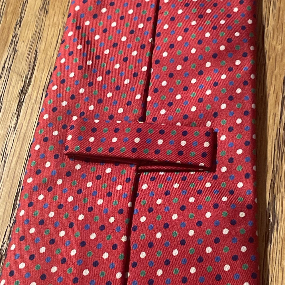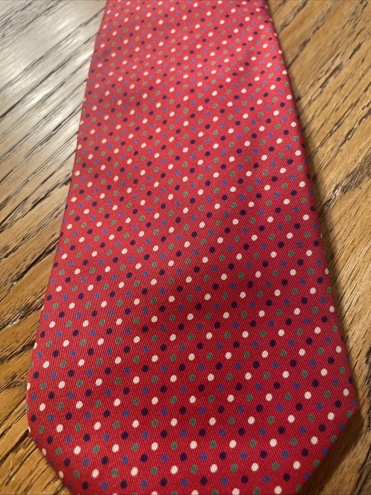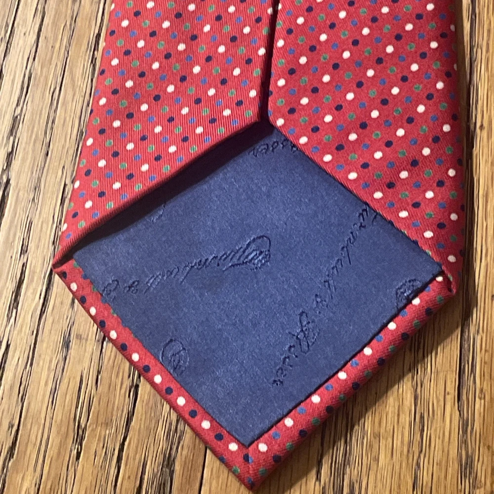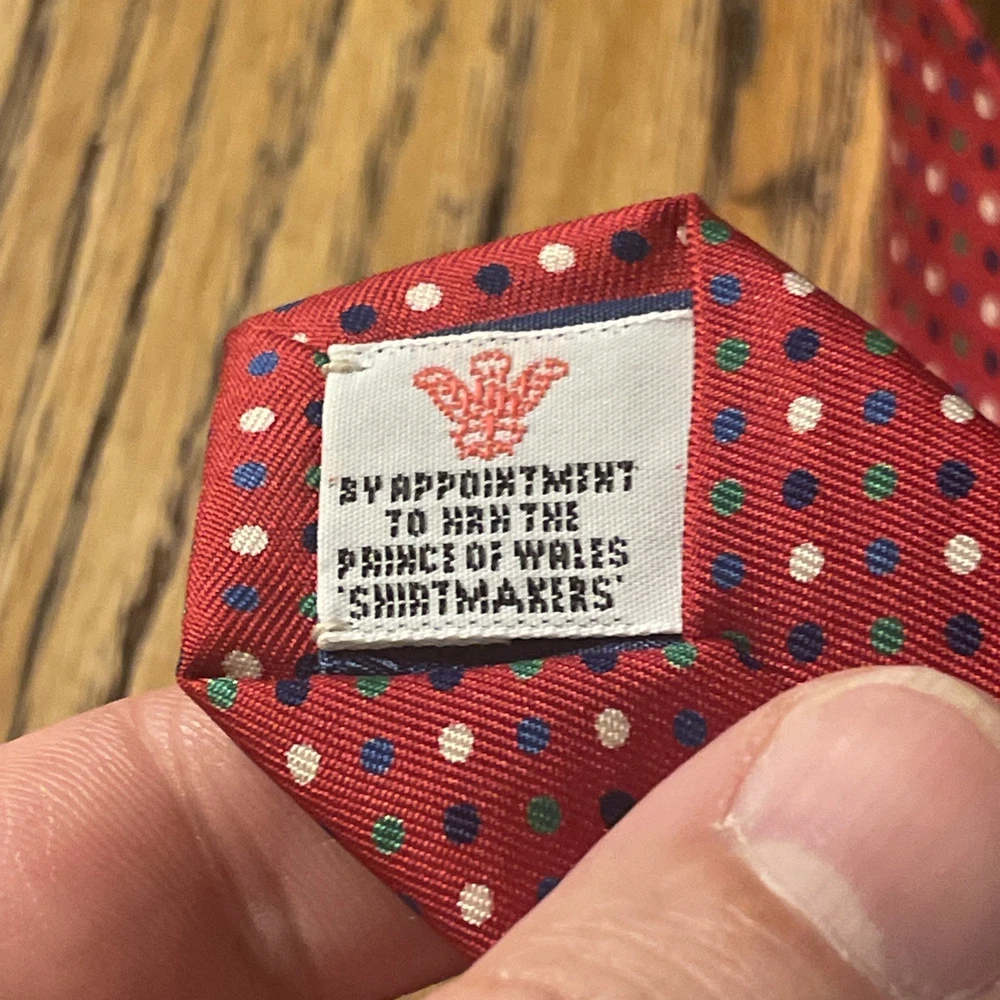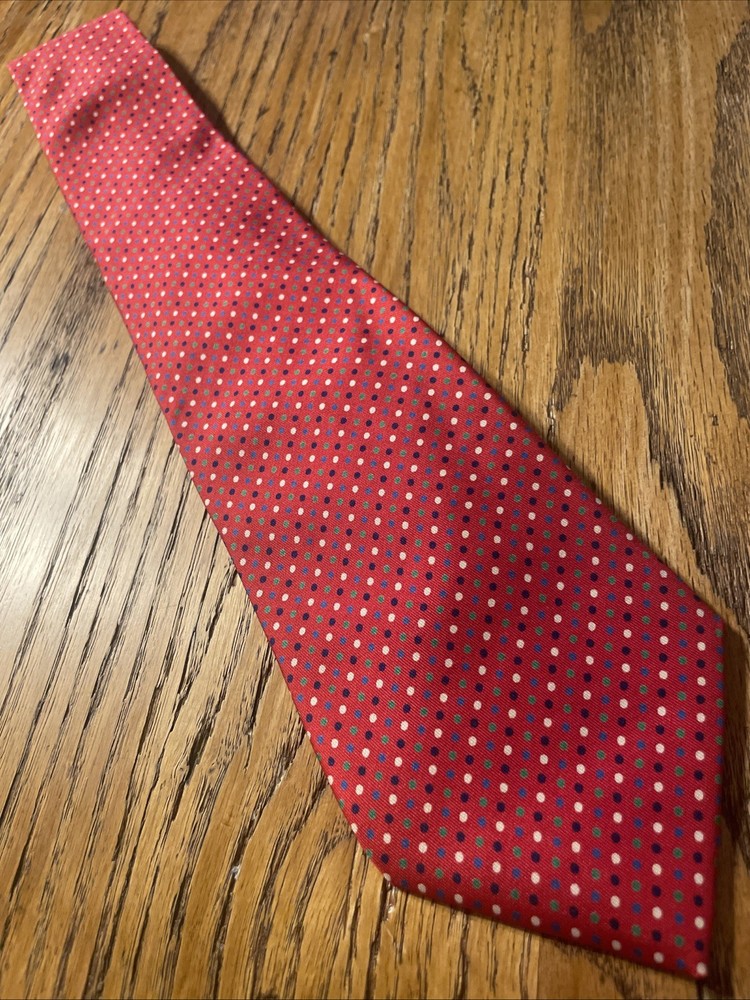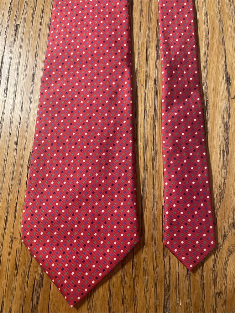 This Vintage Turnbull & Asser Silk Tie is a classic accessory for men, featuring a stylish polka dot pattern on 100% silk fabric made in England. This designer tie adds a touch of sophistication to any outfit, with its multicolor design and satin finish. Perfect for the discerning gentleman looking to elevate his style with a vintage piece from a renowned British brand like Turnbull & Asser.
