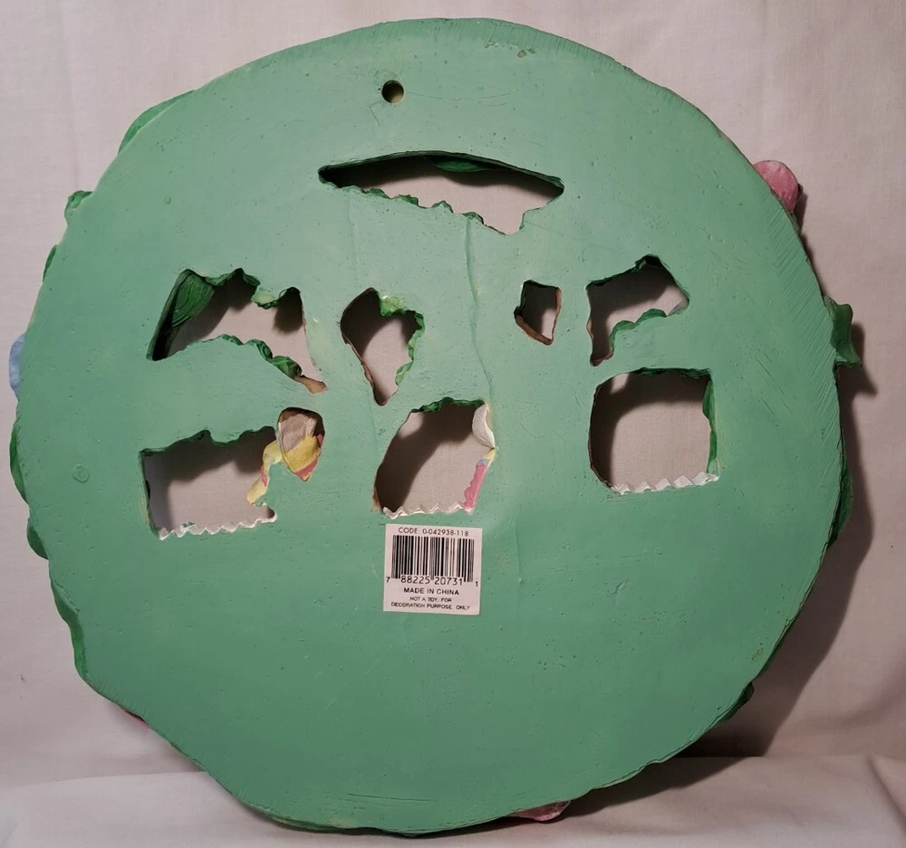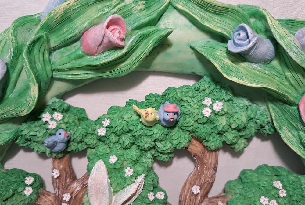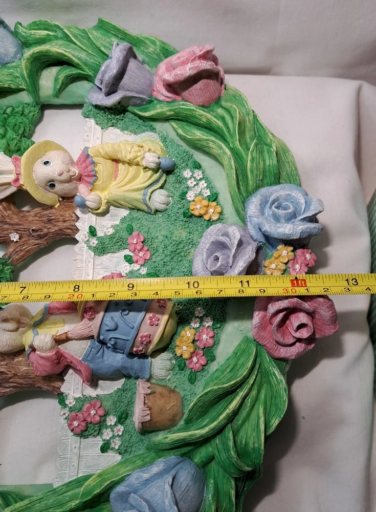 Easter Bunny Eggs Flowers Birds Vintage Easter Wreath Bunnies Resin Approx 12" tall see pictures for measurements I consider to be in VERY GOOD condition Please view all photos zooming in on them as they are part of the description for you to judge condition Will ship either USPS, Fedex or UPS depending on the location of where buyer lives. IMPORTANT - if ships via UPS or Fedex they require a home delivery address as they cannot deliver to post office boxes - NO POST OFFICE BOX