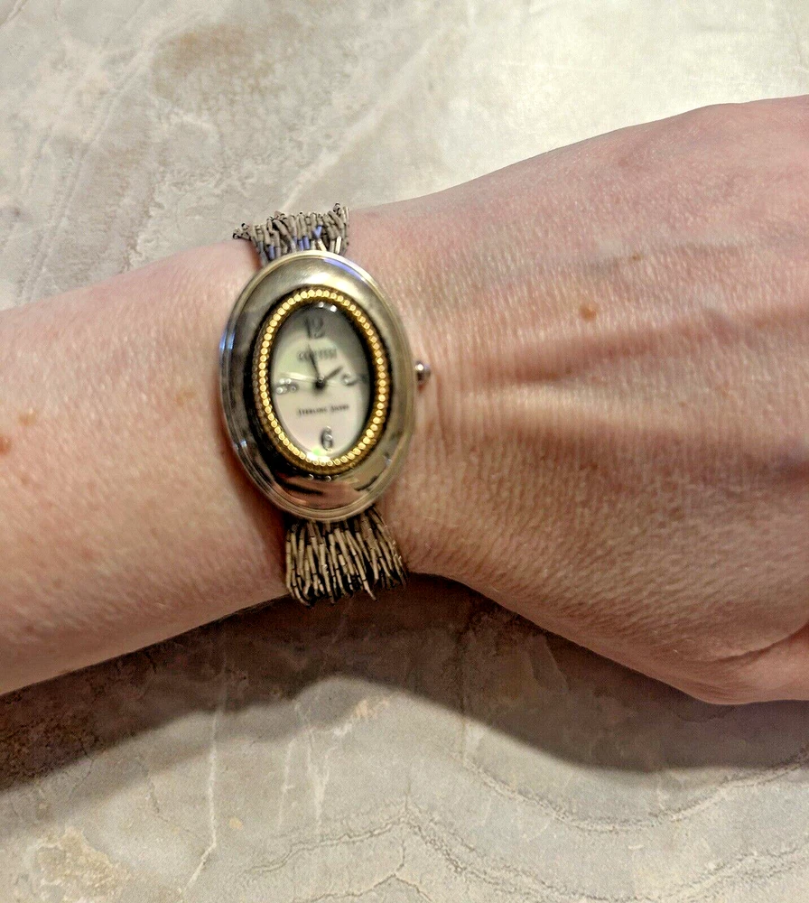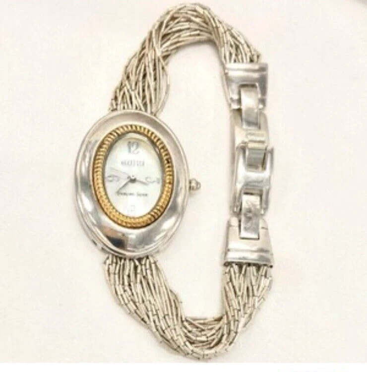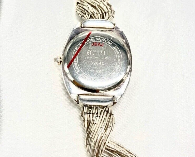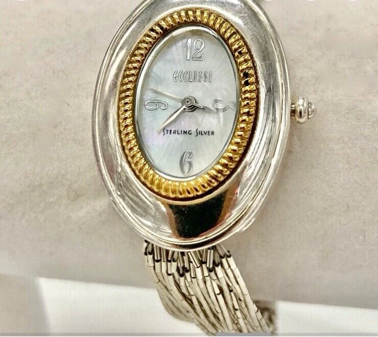This vintage Ecclissi Mother of Pearl Liquid Silver wristwatch for women is a stunning piece that will surely catch anyone's attention. The watch features a beautiful mother of pearl face and sterling silver, liquid silver band. The watch is 925 and has a reference number of 32840. The watch is vintage and does not come with original box/packaging or papers. But with its unique design and elegance, it is still a wonderful addition to any watch collection.
