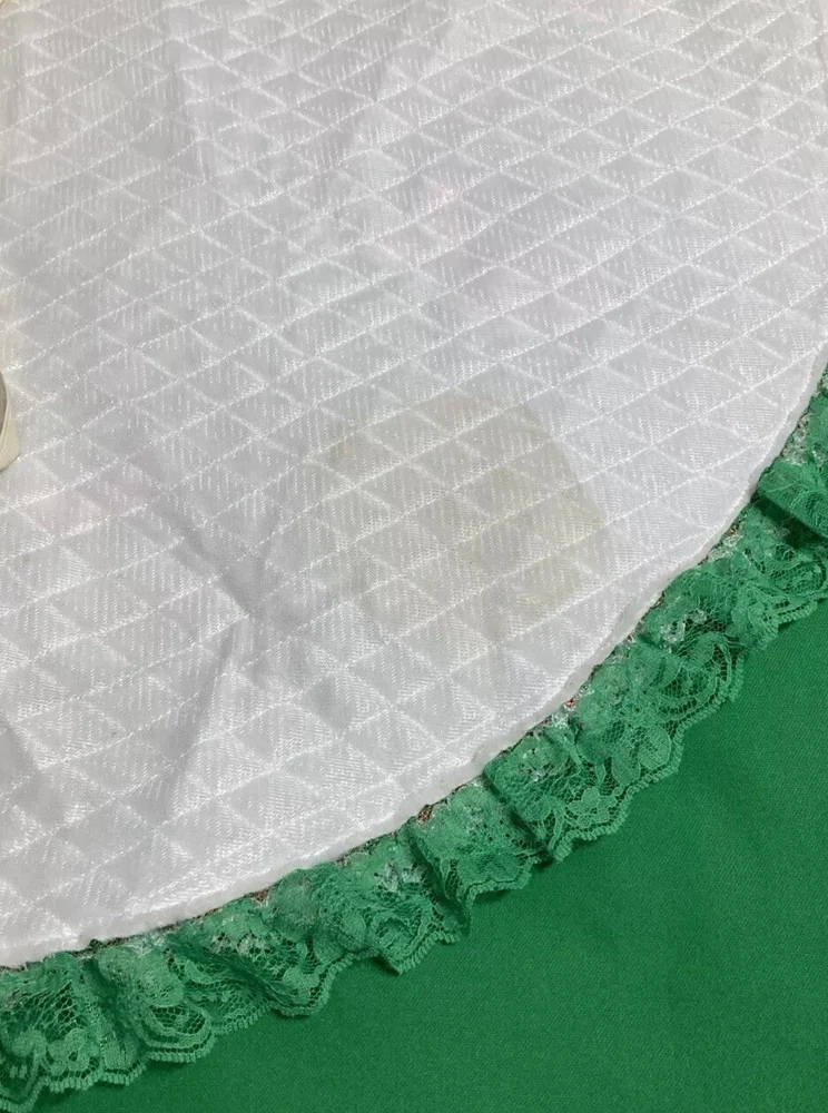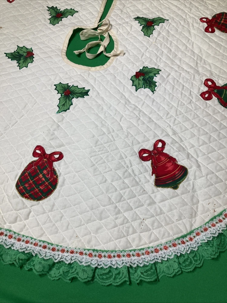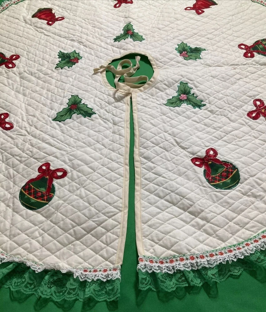 Has age related storage stains but doesn’t feel like it has ever been used. Feels crisp. Tinge of water stain on back but doesn’t seep onto front. I took pictures of all discolorations and I have not tried to clean. FREE SHIPPING Add a touch of vintage charm to your Christmas tree with this handmade quilted double lace ruffle trim tree skirt. The beige color and medium size make it a perfect fit for any tree stand, while the circle shape adds a unique touch to your holiday decor. Made with high-quality materials, this tree skirt is durable and perfect for multiple holiday seasons. Whether you're looking for a classic or eclectic Christmas tree skirt, this vintage piece is sure to impress. Item has not been laundered. Please use photos for better assessment of the item as well as measurements. Feel free to message me through eBay if you have any questions.