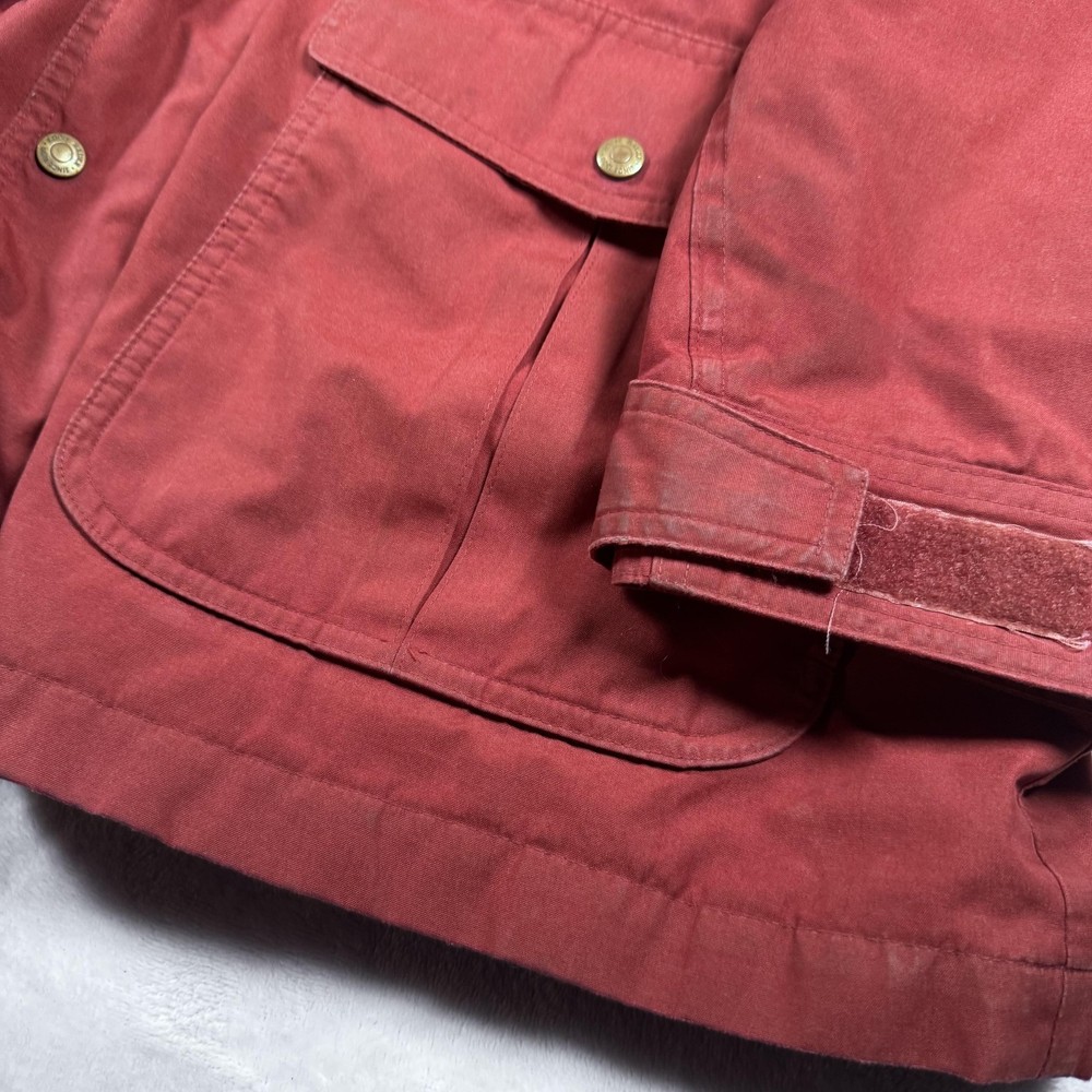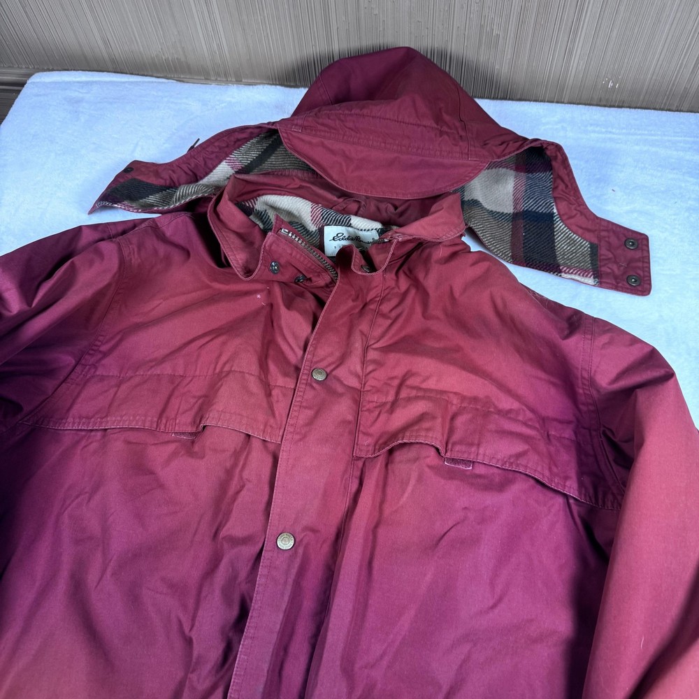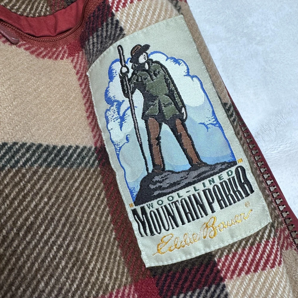 Brand: Eddie Bauer Model: Outdoor Outfitter wool-lined Mountain Parka jacket. Size: Mens XL (per interior tag). Color: Deep red outer shell with tan, brown, black, and red plaid wool lining. Materials: Cotton blend outer shell with wool lining and insulation; made in Hong Kong. Design: Classic longer parka length with full zip front and snap storm flap, detachable hood with plaid underside, stand collar, and adjustable hook-and-loop cuffs. Storage: Chest pockets hidden under front yoke flaps, large lower flap pockets with snap closures, side hand pockets, interior pocket, and rear zip pocket across the back. Details: Eddie Bauer Since 1920 neck label, branded metal snaps, large interior "Wool-Lined Mountain Parka Eddie Bauer" patch, and quilted lower interior for added warmth; vintage 1980s outdoor hiking style.