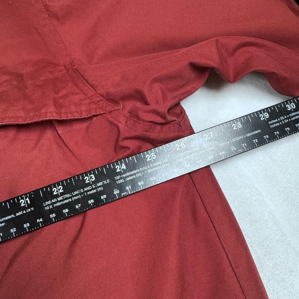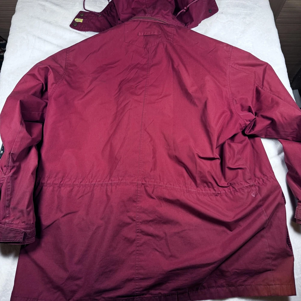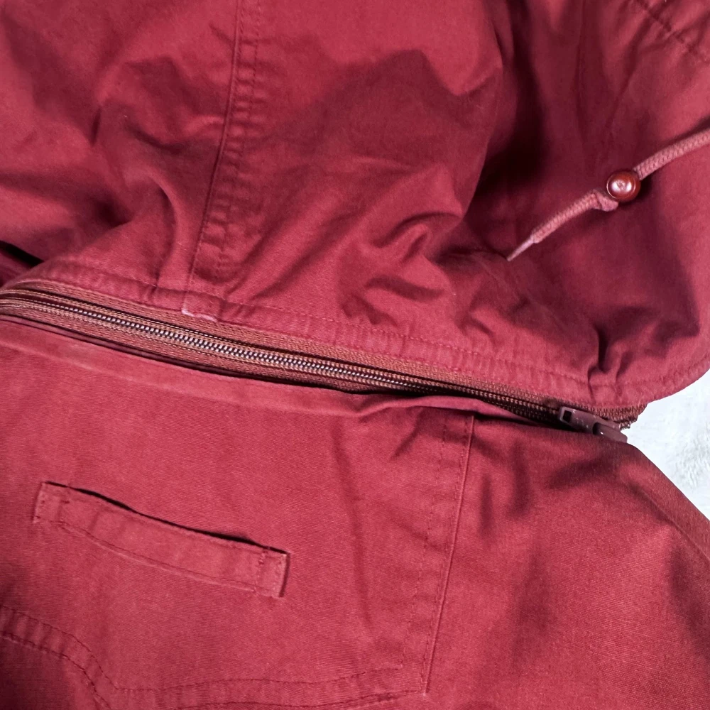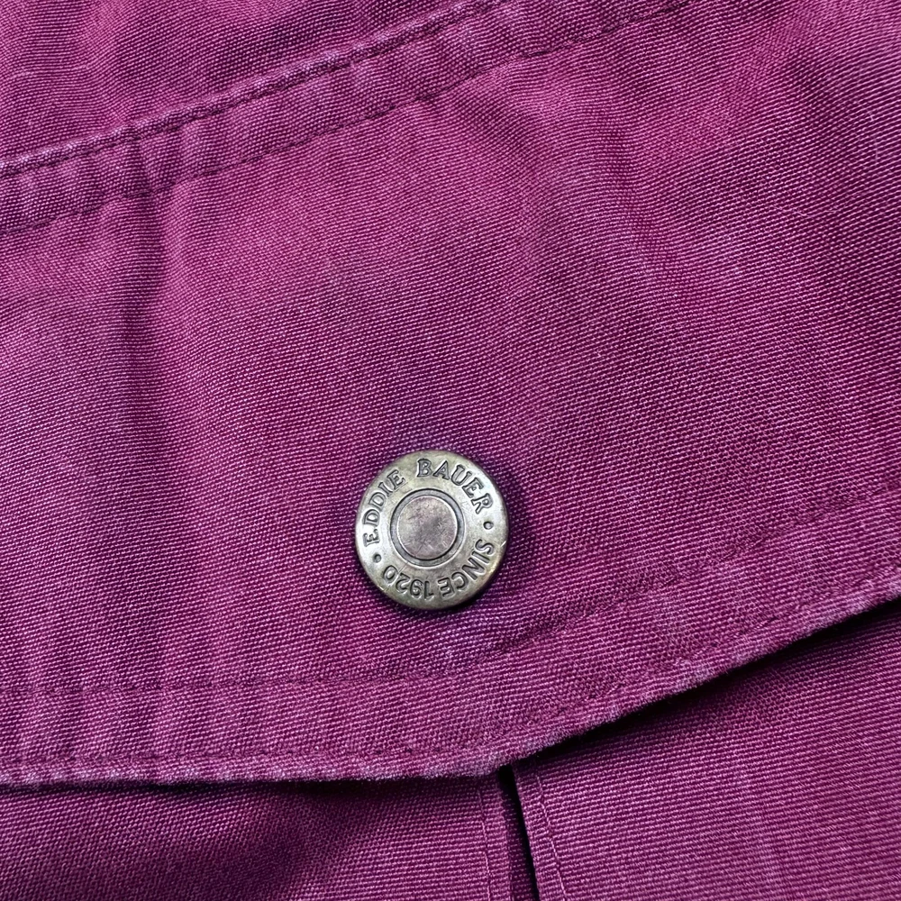 Brand: Eddie Bauer Model: Outdoor Outfitter wool-lined Mountain Parka jacket. Size: Mens XL (per interior tag). Color: Deep red outer shell with tan, brown, black, and red plaid wool lining. Materials: Cotton blend outer shell with wool lining and insulation; made in Hong Kong. Design: Classic longer parka length with full zip front and snap storm flap, detachable hood with plaid underside, stand collar, and adjustable hook-and-loop cuffs. Storage: Chest pockets hidden under front yoke flaps, large lower flap pockets with snap closures, side hand pockets, interior pocket, and rear zip pocket across the back. Details: Eddie Bauer Since 1920 neck label, branded metal snaps, large interior "Wool-Lined Mountain Parka Eddie Bauer" patch, and quilted lower interior for added warmth; vintage 1980s outdoor hiking style.