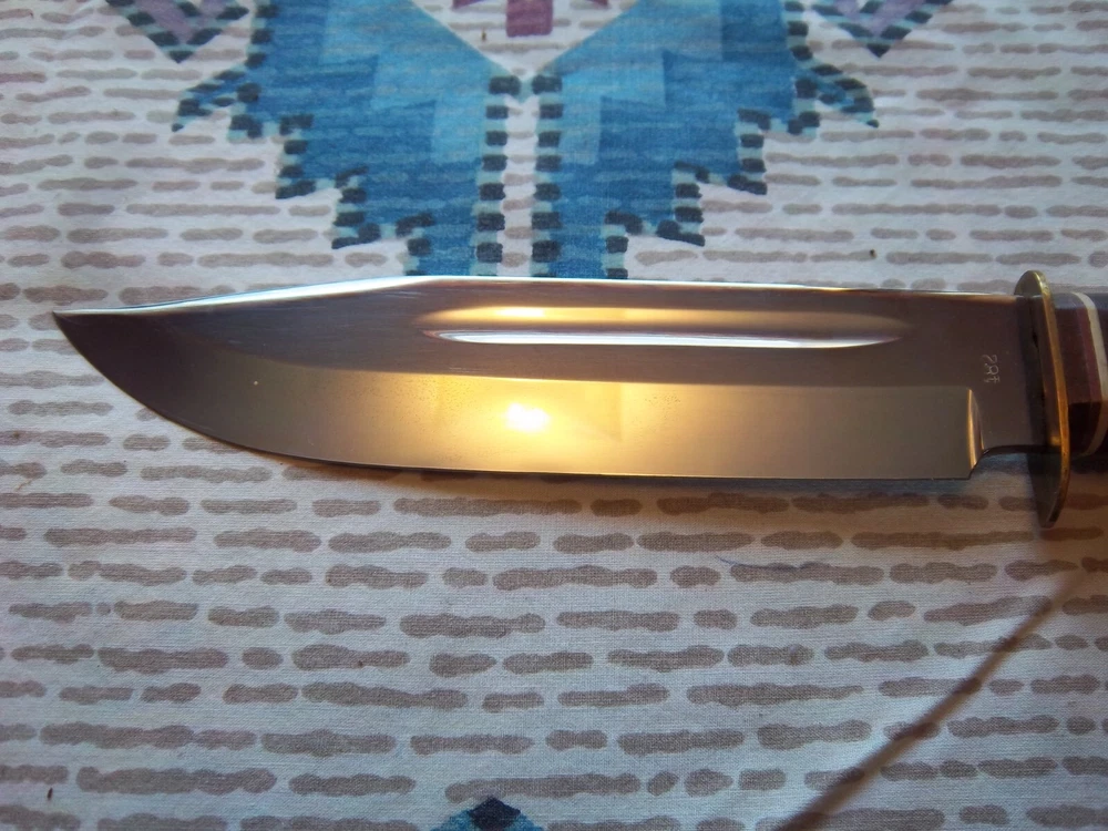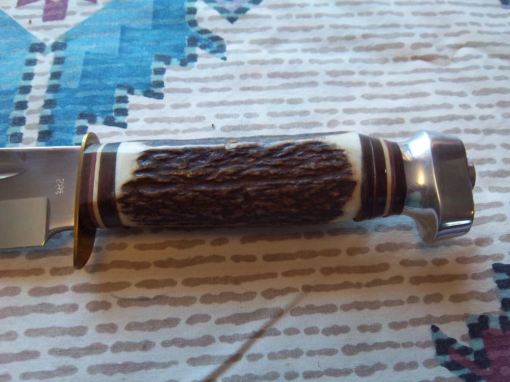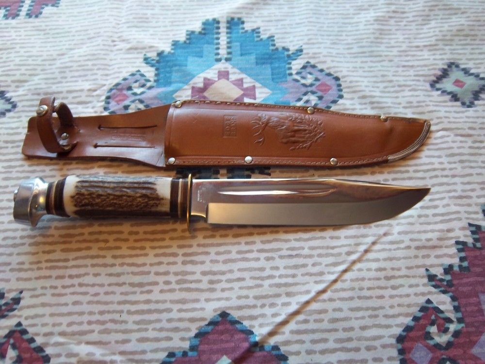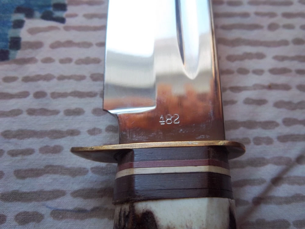 Must be 18 years old or older to buy.Vintage Edge Mark Knife 482 made in Germany, never used or carried, overall length 12",blade 7 1/4", stag handle. Stamped on blade EDGE MARK SOLINGEN GERMANY, 482. Blade has acouple very light scratches,not from use / acouple pepper specs, two small dings on blade edge,can't feel them,hard to see. Not the right sheath has EDGE BRAND, MADE IN GERMANY stamped on it, has been restitched some, also sheath is about 1 1/2" to long for the knife. Shipping cost $15.00
