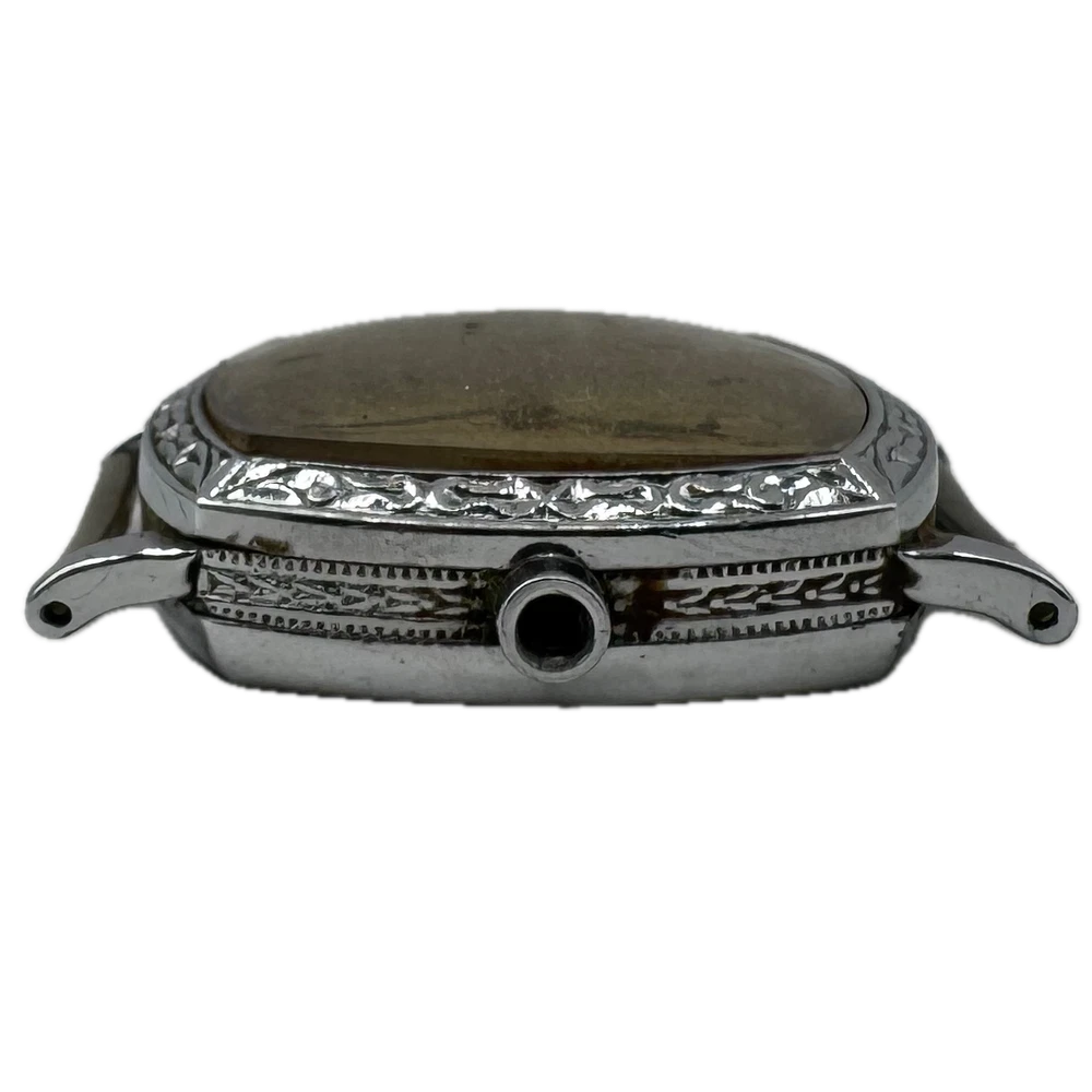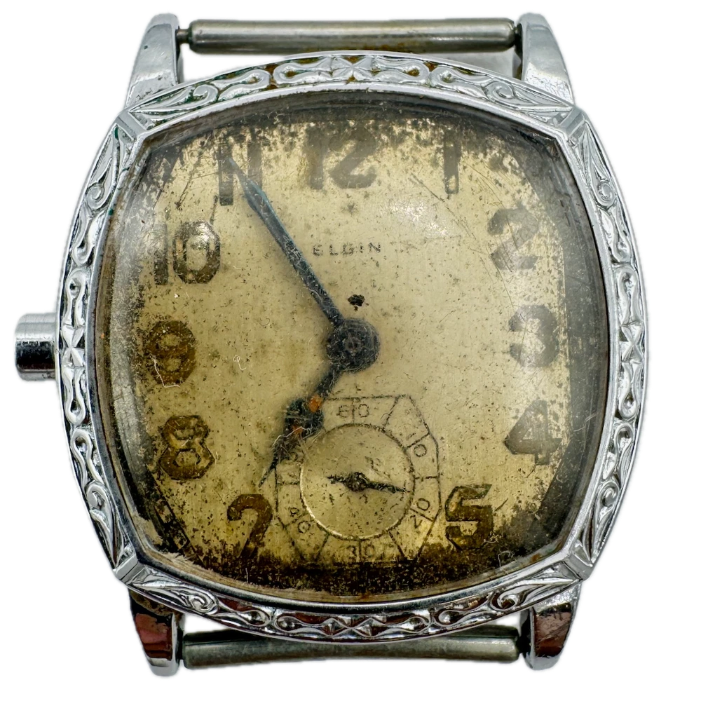 Vintage Elgin Fancy Engraved Decoq Men's Mechanical Wristwatch 464 Incomplete Product Description Item: Wristwatch Brand: Elgin Model: Fancy Engraved Decoq Movement: Mechanical Case Material: Aluminium Gender: Men's Grade: 464 Product Measurements Diameter: 31mm Lug Width: 19.5mm Lug to Lug: 37mm Thickness: 10.5 mm Product Condition Overall Condition: Poor, overall condition for its age. Functions: Not running as it is for parts Case: There are scratches on the case. Crystal: There are scratches on the crystal. Additional Information: It is missing most of the movement. About the brand: First founded in 1864 as the National Watch Company, Elgin watches were produced out of Elgin, Illinois at the world's largest dedicated watch production facility of the time. By 1910 - Elgin had built an observatory to help with the accuracy of their timepieces. Like most watch manufacturers, Elgin moved to defense production during the second World War and produced military issue watches such as the well known Elgin A-11. After the war, production of Elgin watches slowed and they transferred production to South Carolina. As the influx of Swiss watches came into the market, the Elgin brand sold its entities in 1968, and the name rights of the company were subsequently re-sold in the following years. Although the Elgin National Watch Company no longer exists, their impact on American watch making is seen through their large catalog of excellent vintage watches.