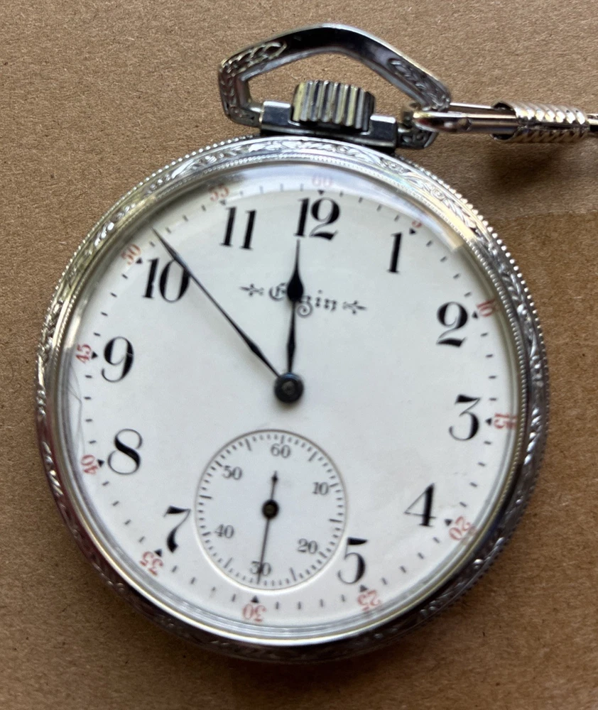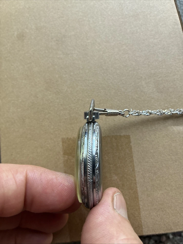 The Elgin Open Face Base Metal Pocket Watch is a vintage timepiece with a classic design. Featuring a damaskeened movement finish, Arabic numerals on the indices, and a white single sunk dial, this pocket watch exudes a casual style perfect for everyday wear. The watch has a screwback caseback and comes with features such as an acrylic crystal, seconds hand, 12-hour dial, and enameled dial. With a base metal case in a satin-finished silver color, this pocket watch from the United States is a unique and charming accessory for men who appreciate a mix of nostalgia and modern functionality. It is used in ok condition works fine. Don’t know how many jewels it is It’s not written inside.? Please check all pics selling as is No returns or refund