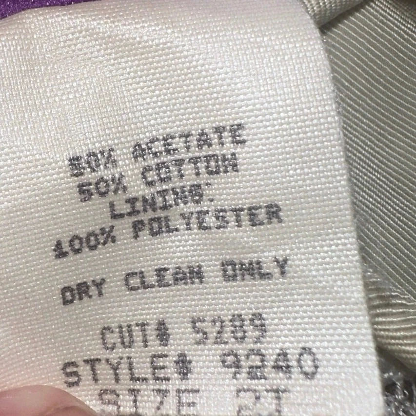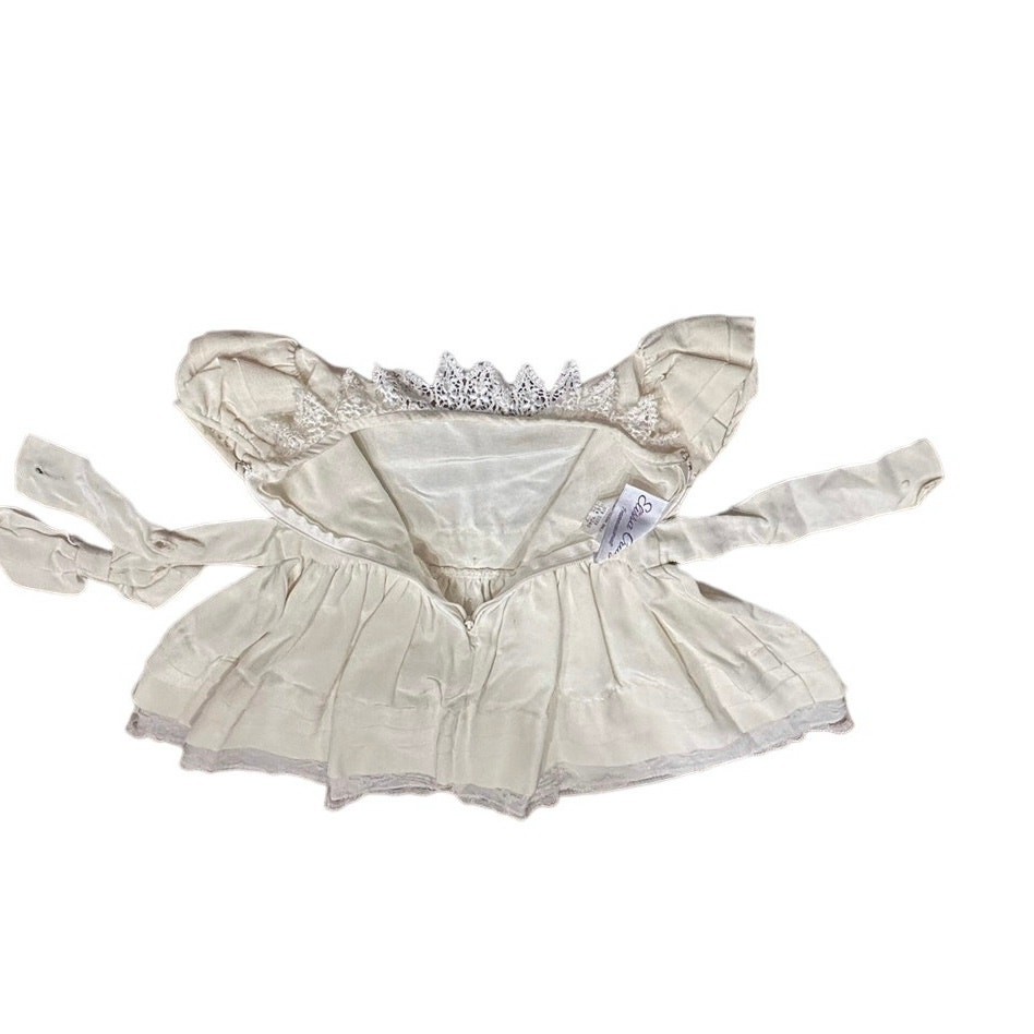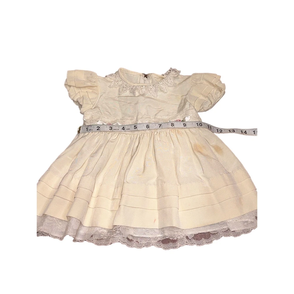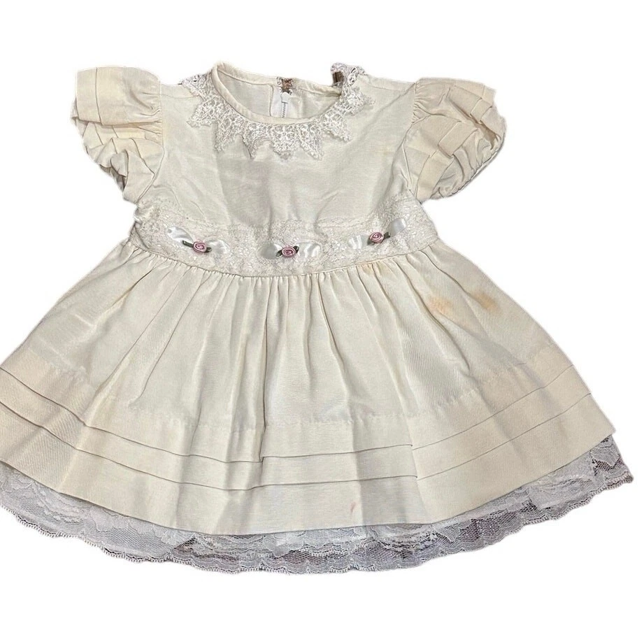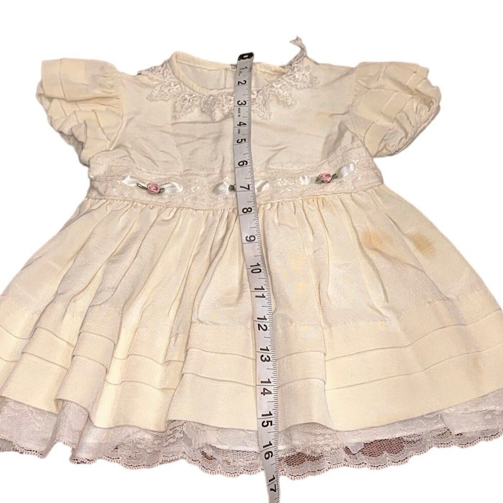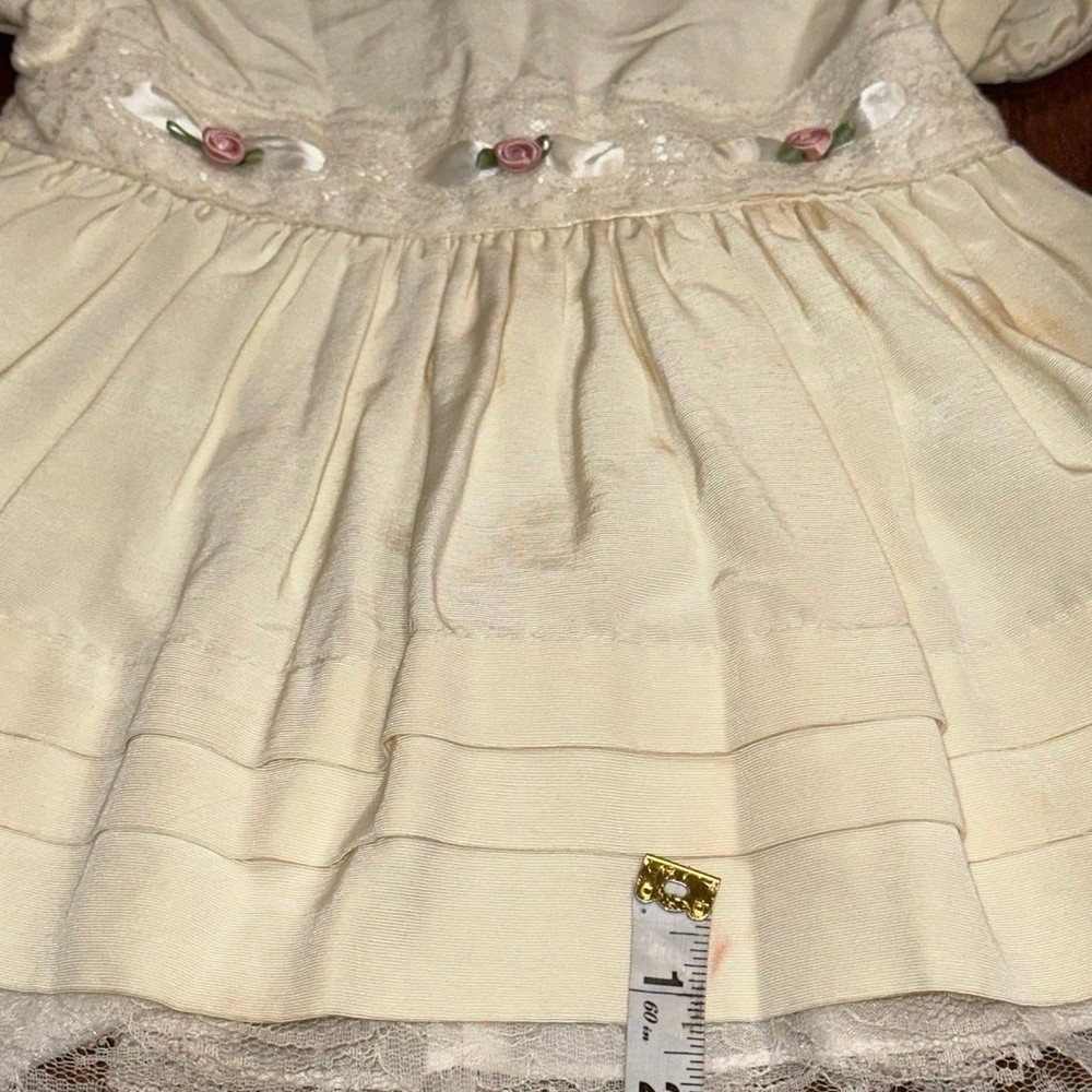 Vintage Elissa Craig International baby dress, size 2T. Classic puff-sleeve design with rose embellishments at the waist, lace detailing at the neckline and hem, and a buttoned bow accent at the back. Fully lined. Back zipper closure works perfectly. This dress is dry clean only. There is visible staining near the waistband and lower skirt, and the dress has not been treated or cleaned. It is wrinkled from storage. Despite the flaws, it is structurally intact with no holes or tears, and the lace trim is still in great condition. Fabric is 50 percent acetate and 50 percent cotton with a 100 percent polyester lining. This piece would be lovely for a vintage-themed photo shoot, special occasion, costume, or collector’s display. Priced to sell. Please review all photos and ask any questions before purchasing. I need it gone.