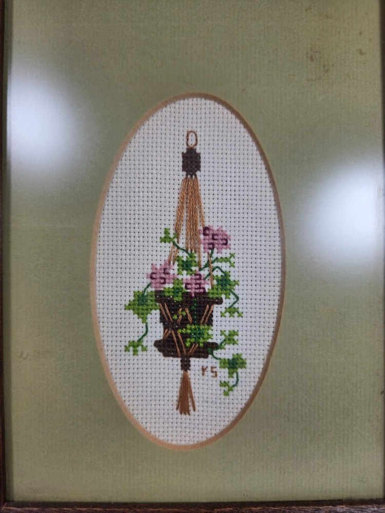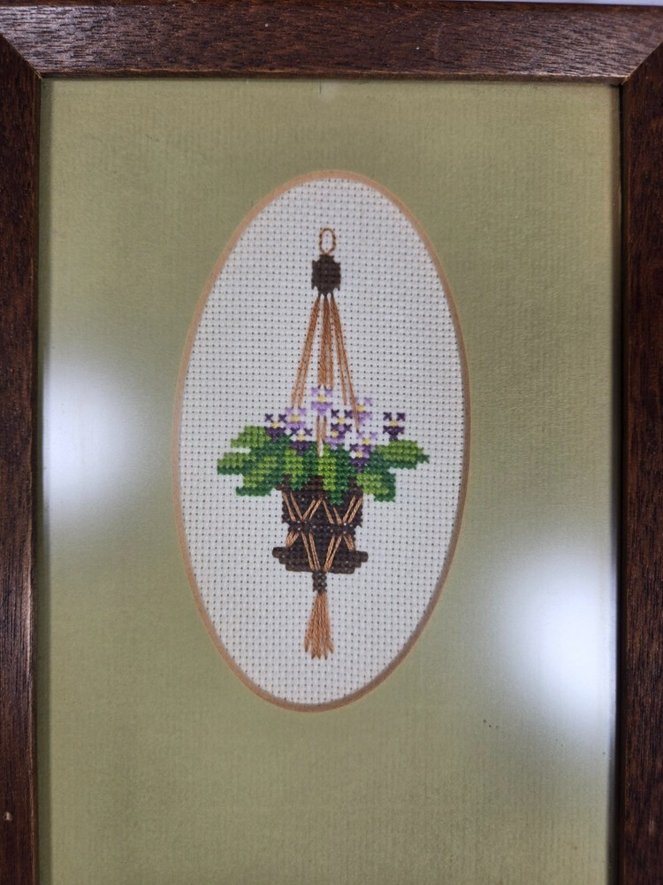 Vintage Embroidery, Framed, Plants in Hanging Vases Wall Art 14x6 inches Please see photos or reach out with any questions FREE SHIPPING. 3 DAYS HANDLING.