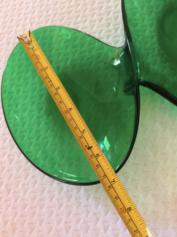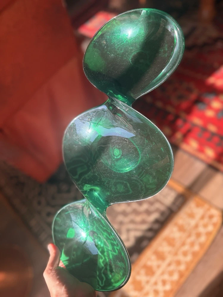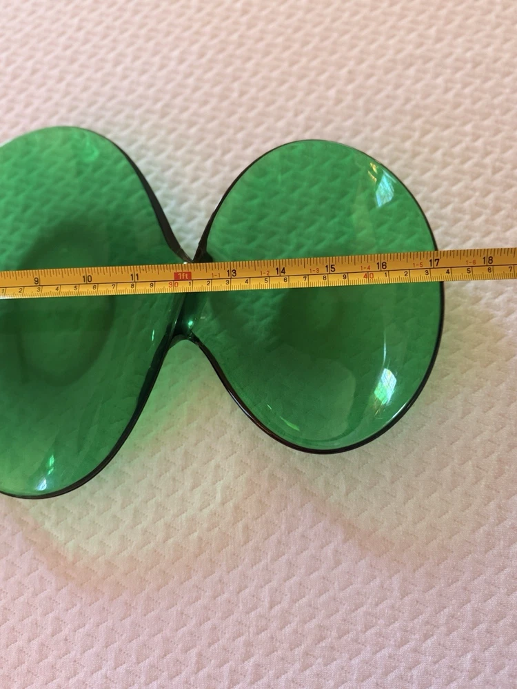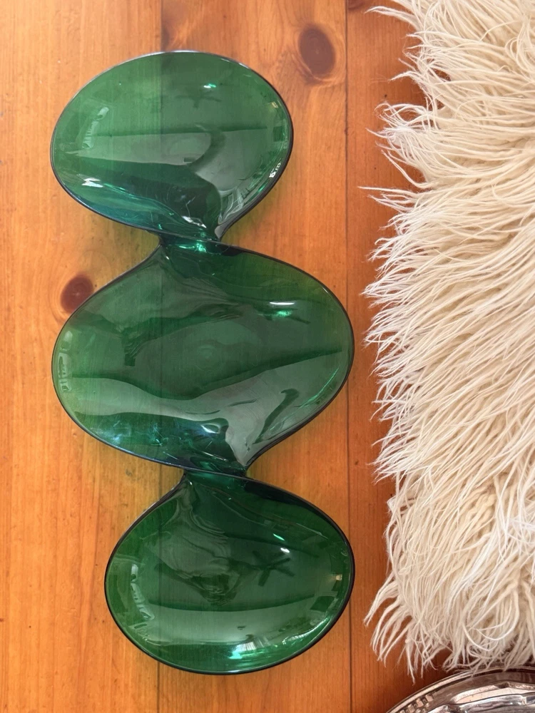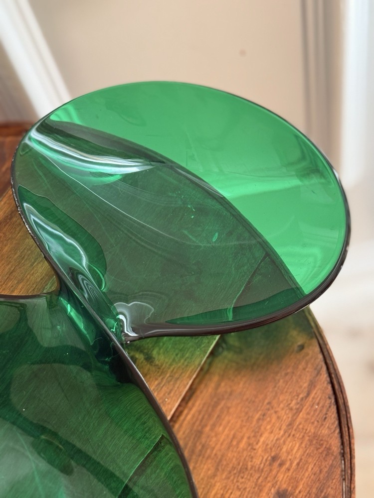 Vintage emerald green lucite sculptural centerpiece bowl, circa 1970s–1980s. This striking design features a flowing, organic form that feels very Space Age / Postmodern. The rich translucent green acrylic catches light beautifully and makes a dramatic statement on a console table, coffee table, or shelf. Measures approximately: • Length: approx. 23–24 inches • Width (each bowl): approx. 8–9 inches • Height: approx. 1 inch Material: Molded acrylic / lucite Color: Emerald green, translucent Good vintage condition with typical surface wear consistent with age. Light surface scratches present (common with acrylic), but no cracks or structural damage. Displays beautifully. This is an unmarked piece. Style is reminiscent of 1970s modernist and Hollywood regency.